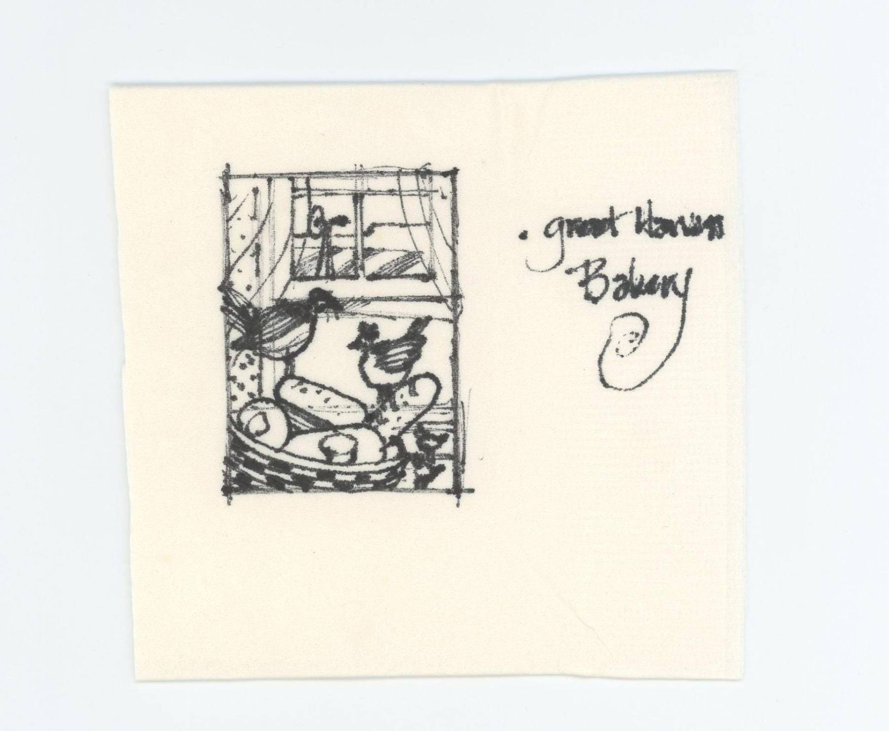 Basic concept drawing on a cocktail napkin. 4 1/2 by 4 1/4". Monte Dolack (Born 1950) is active/lives in Montana. Monte Dolack is known for Poster illustration, landscape and wildlife painting. A native of Great Falls, Monte Dolack grew up surrounded by the same sweeping vistas and big sky that inspired Charlie Russell. His love of Montana and passion for the West's diverse landscapes and wildlife are evident in the images he creates and the commissions he undertakes. After studying art at Montana State University and The University of Montana, Monte opened his first studio in 1974, beginning a career in fine art and graphics. His best known early works - wild animals wreaking havoc in human homes - comprise his Invaders Series, exploring the myths of the West and how we view our relationship with our environment. The irresistible appeal of these images helped build Monte's national reputation and continues to attract collectors. Monte has been the recipient of a number of prestigious awards in the course of his career, and his work is part of the collection of the Library of Congress, the American Association of Museums, the National Wildfire Foundation and numerous other museums and corporations. Recent exhibitions include The Montana Exhibition, Manawatu Art Museum, New Zealand; Artists of the American West, Bank of Ireland Arts Centre, Dublin, Ireland, and The Kumamoto Prefectural Art Museum, Kumamoto, Japan. Monte's work was chosen to be included in The North American Print Biennial, Boston, MA and New American Paintings, a Western States competition sponsored by the Open Studio Press as well as five major museums in China including the National Art Museum of Bejing, as part of the New West Exhibition. In 2011 he exhibited at the Palace of Nations at the United Nations, Geneva Switzerland. He was selected at the turn of the century by the Missoulian as one of the 100 most influential Montanans of the twentieth century and recently received the distinguished Fine Arts Alumni Award from the University of Montana along with his wife, Mary Beth Percival. A love of the natural world, combined with his exuberant curiosity and travel experiences, has shaped the content of Monte's imagery. Blending mythology, technology and elements from nature, his work is infused with a sense of humor and irony. Monte's keen interest in environmental issues has lead to commissions for the Nature Conservancy, Defenders of Wildlife and Trout Unlimited as well as over 200 posters and prints for various organizations. In addition to his acrylic, oil and watercolor painting, Monte continues to pursue his interest in traditional printmaking, having created numerous original lithographs. Since 1993, with his wife, Mary Beth Percival and staff, he operates a flourishing gallery in downtown Missoula. Monte and Mary Beth have traveled extensively in the US, Europe, Mexico, New Zealand and Japan, visiting important cultural sites and museums and making paintings from their travels.