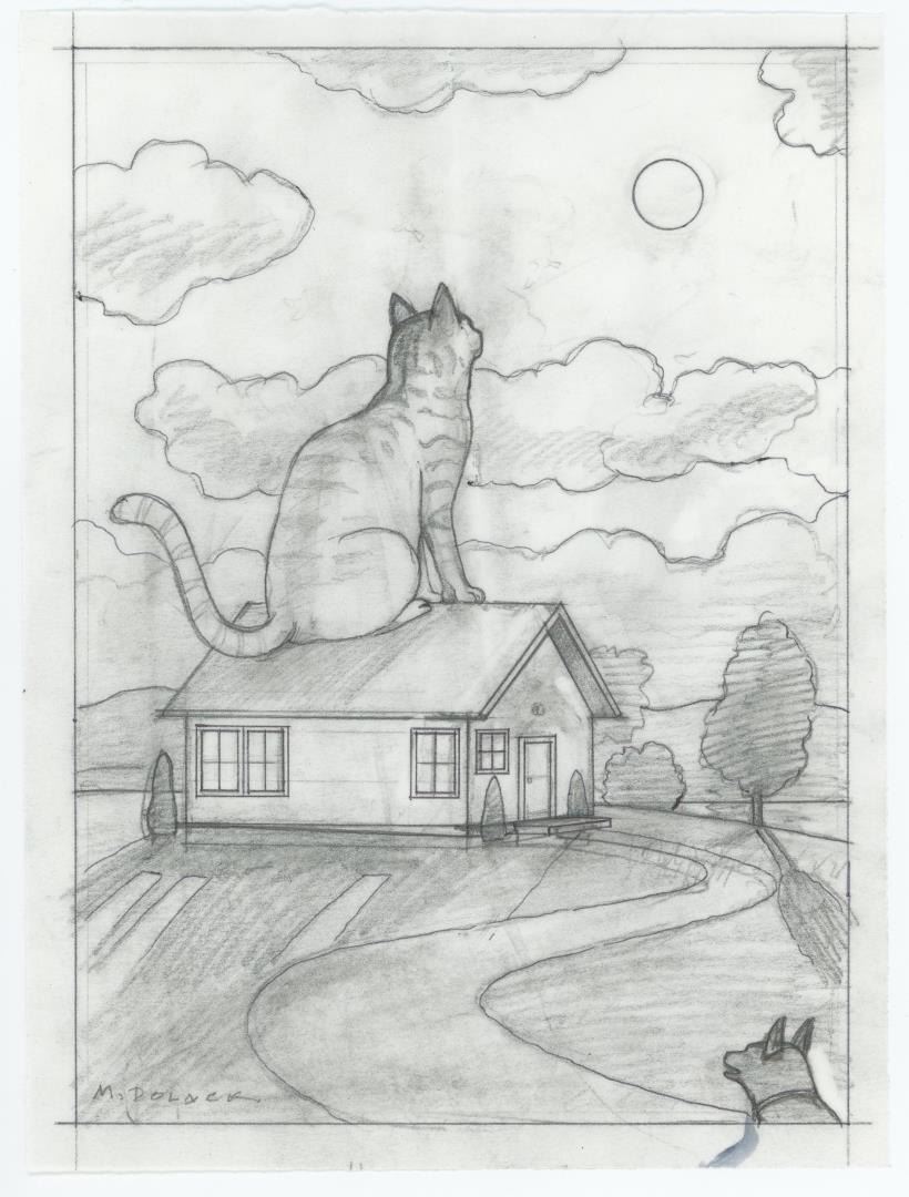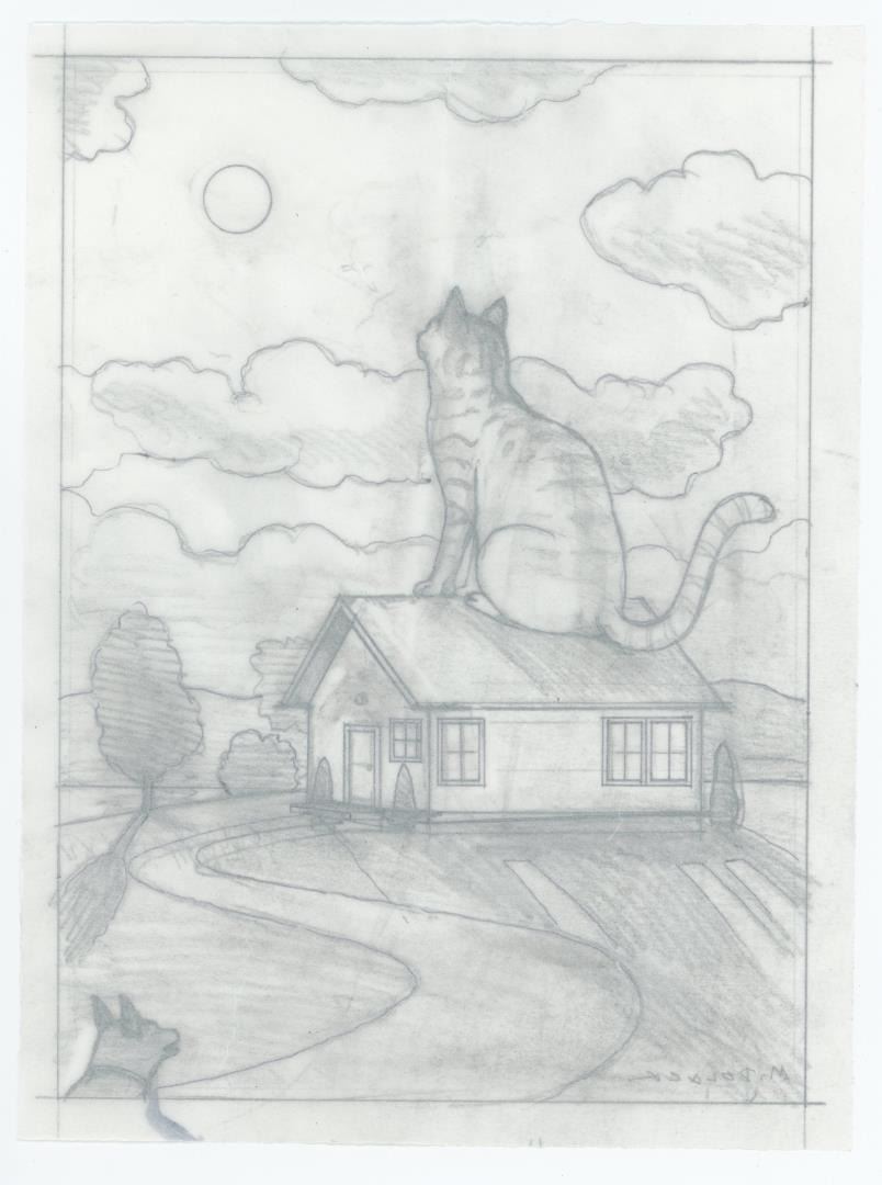 A study for an acrylic painting titled House Cat created by the artist in 1995. 9 3/8" by 7" Monte Dolack (Born 1950) is active/lives in Montana. Monte Dolack is known for Poster illustration, landscape and wildlife painting. A native of Great Falls, Monte Dolack grew up surrounded by the same sweeping vistas and big sky that inspired Charlie Russell. His love of Montana and passion for the West's diverse landscapes and wildlife are evident in the images he creates and the commissions he undertakes. After studying art at Montana State University and The University of Montana, Monte opened his first studio in 1974, beginning a career in fine art and graphics. His best known early works - wild animals wreaking havoc in human homes - comprise his Invaders Series, exploring the myths of the West and how we view our relationship with our environment. The irresistible appeal of these images helped build Monte's national reputation and continues to attract collectors. Monte has been the recipient of a number of prestigious awards in the course of his career, and his work is part of the collection of the Library of Congress, the American Association of Museums, the National Wildfire Foundation and numerous other museums and corporations. Recent exhibitions include The Montana Exhibition, Manawatu Art Museum, New Zealand; Artists of the American West, Bank of Ireland Arts Centre, Dublin, Ireland, and The Kumamoto Prefectural Art Museum, Kumamoto, Japan. Monte's work was chosen to be included in The North American Print Biennial, Boston, MA and New American Paintings, a Western States competition sponsored by the Open Studio Press as well as five major museums in China including the National Art Museum of Bejing, as part of the New West Exhibition. In 2011 he exhibited at the Palace of Nations at the United Nations, Geneva Switzerland. He was selected at the turn of the century by the Missoulian as one of the 100 most influential Montanans of the twentieth century and recently received the distinguished Fine Arts Alumni Award from the University of Montana along with his wife, Mary Beth Percival. A love of the natural world, combined with his exuberant curiosity and travel experiences, has shaped the content of Monte's imagery. Blending mythology, technology and elements from nature, his work is infused with a sense of humor and irony. Monte's keen interest in environmental issues has lead to commissions for the Nature Conservancy, Defenders of Wildlife and Trout Unlimited as well as over 200 posters and prints for various organizations. In addition to his acrylic, oil and watercolor painting, Monte continues to pursue his interest in traditional printmaking, having created numerous original lithographs. Since 1993, with his wife, Mary Beth Percival and staff, he operates a flourishing gallery in downtown Missoula. Monte and Mary Beth have traveled extensively in the US, Europe, Mexico, New Zealand and Japan, visiting important cultural sites and museums and making paintings from their travels.