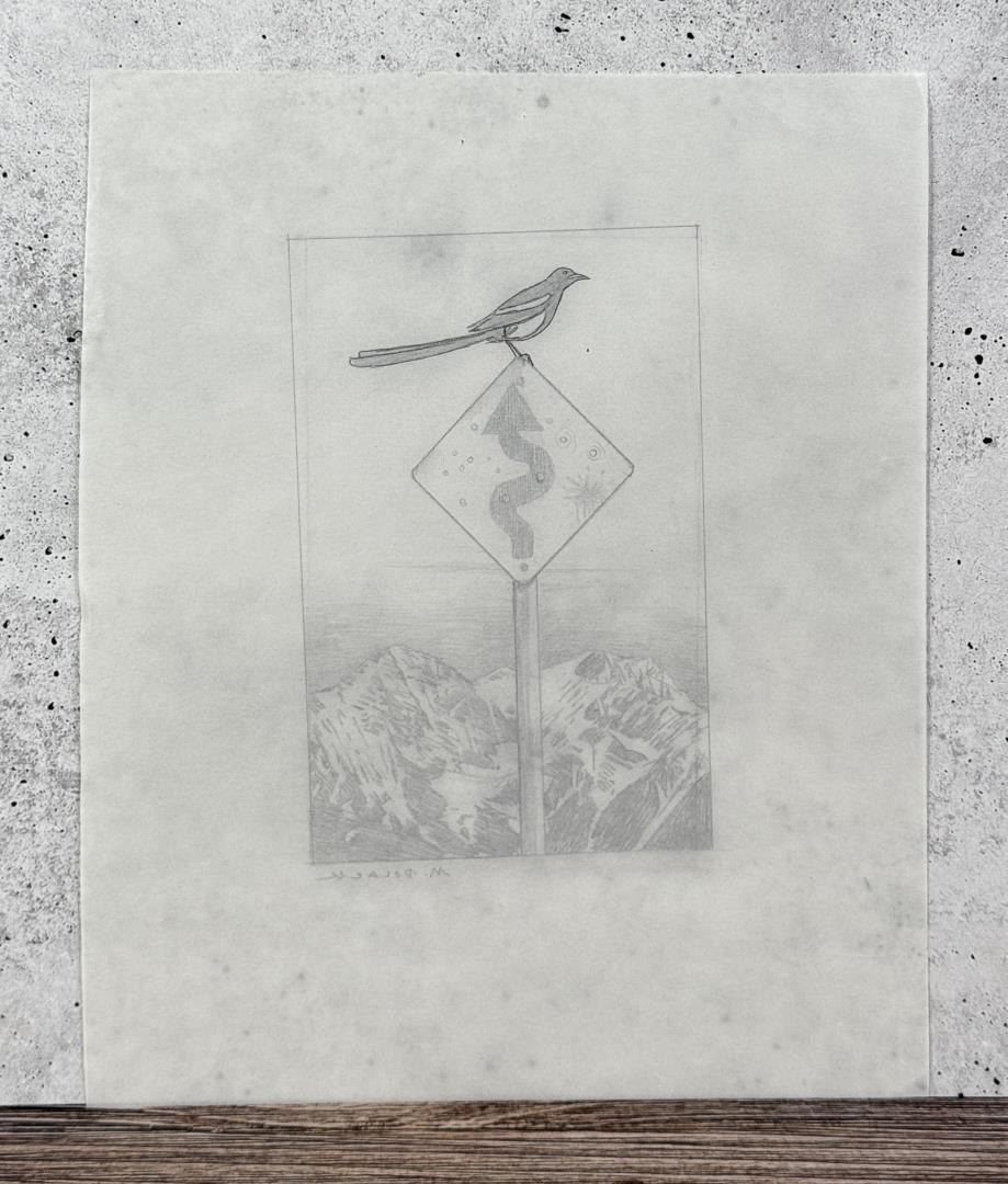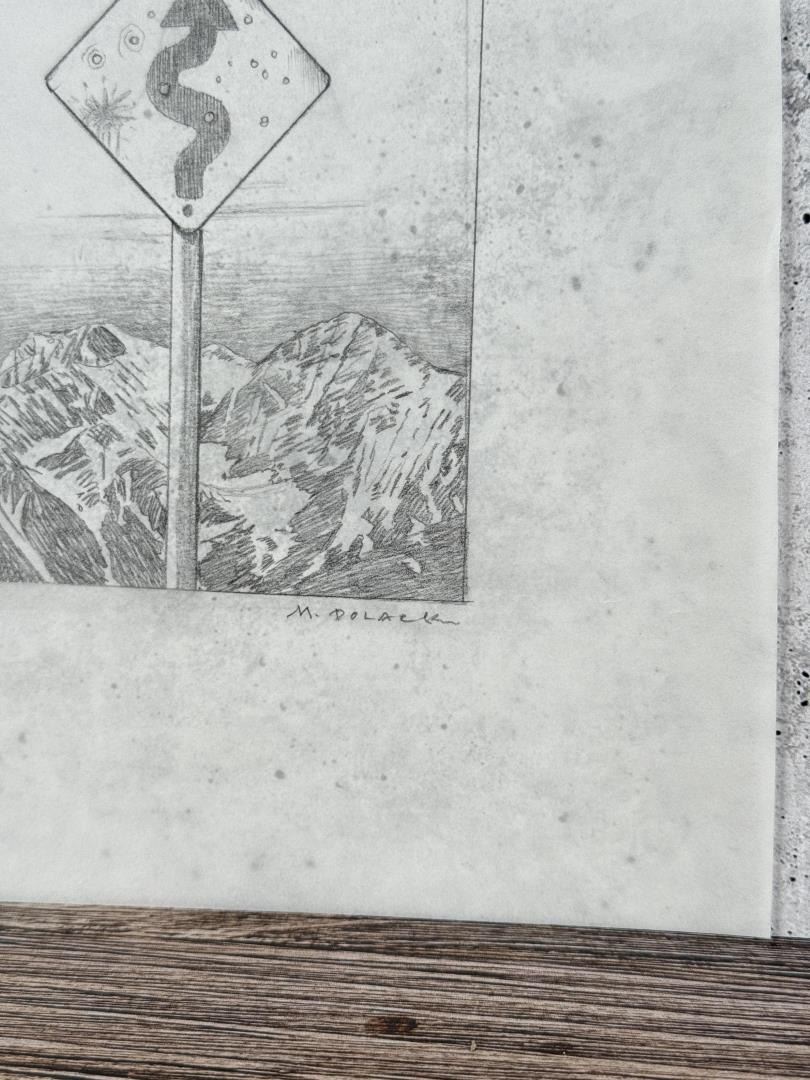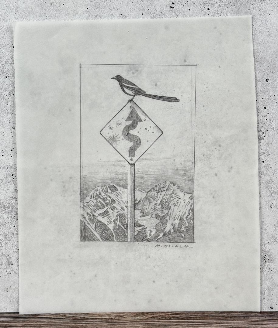 This study became an acrylic painting and later a limited edition print. 10 5/8" by 8 3/4" Monte Dolack (Born 1950) is active/lives in Montana. Monte Dolack is known for Poster illustration, landscape and wildlife painting. A native of Great Falls, Monte Dolack grew up surrounded by the same sweeping vistas and big sky that inspired Charlie Russell. His love of Montana and passion for the West's diverse landscapes and wildlife are evident in the images he creates and the commissions he undertakes. After studying art at Montana State University and The University of Montana, Monte opened his first studio in 1974, beginning a career in fine art and graphics. His best known early works - wild animals wreaking havoc in human homes - comprise his Invaders Series, exploring the myths of the West and how we view our relationship with our environment. The irresistible appeal of these images helped build Monte's national reputation and continues to attract collectors. Monte has been the recipient of a number of prestigious awards in the course of his career, and his work is part of the collection of the Library of Congress, the American Association of Museums, the National Wildfire Foundation and numerous other museums and corporations. Recent exhibitions include The Montana Exhibition, Manawatu Art Museum, New Zealand; Artists of the American West, Bank of Ireland Arts Centre, Dublin, Ireland, and The Kumamoto Prefectural Art Museum, Kumamoto, Japan. Monte's work was chosen to be included in The North American Print Biennial, Boston, MA and New American Paintings, a Western States competition sponsored by the Open Studio Press as well as five major museums in China including the National Art Museum of Bejing, as part of the New West Exhibition. In 2011 he exhibited at the Palace of Nations at the United Nations, Geneva Switzerland. He was selected at the turn of the century by the Missoulian as one of the 100 most influential Montanans of the twentieth century and recently received the distinguished Fine Arts Alumni Award from the University of Montana along with his wife, Mary Beth Percival. A love of the natural world, combined with his exuberant curiosity and travel experiences, has shaped the content of Monte's imagery. Blending mythology, technology and elements from nature, his work is infused with a sense of humor and irony. Monte's keen interest in environmental issues has lead to commissions for the Nature Conservancy, Defenders of Wildlife and Trout Unlimited as well as over 200 posters and prints for various organizations. In addition to his acrylic, oil and watercolor painting, Monte continues to pursue his interest in traditional printmaking, having created numerous original lithographs. Since 1993, with his wife, Mary Beth Percival and staff, he operates a flourishing gallery in downtown Missoula. Monte and Mary Beth have traveled extensively in the US, Europe, Mexico, New Zealand and Japan, visiting important cultural sites and museums and making paintings from their travels.