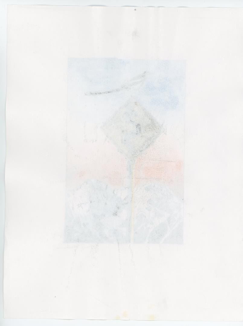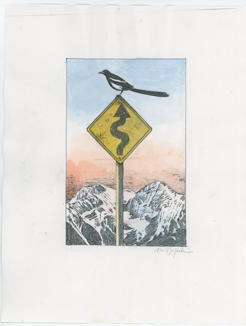 This study became an acrylic painting and later a limited edition print. Included is a photo of the road sign that inspired the artist. 11" by 8 3/8". Monte Dolack (Born 1950) is active/lives in Montana. Monte Dolack is known for Poster illustration, landscape and wildlife painting. A native of Great Falls, Monte Dolack grew up surrounded by the same sweeping vistas and big sky that inspired Charlie Russell. His love of Montana and passion for the West's diverse landscapes and wildlife are evident in the images he creates and the commissions he undertakes. After studying art at Montana State University and The University of Montana, Monte opened his first studio in 1974, beginning a career in fine art and graphics. His best known early works - wild animals wreaking havoc in human homes - comprise his Invaders Series, exploring the myths of the West and how we view our relationship with our environment. The irresistible appeal of these images helped build Monte's national reputation and continues to attract collectors. Monte has been the recipient of a number of prestigious awards in the course of his career, and his work is part of the collection of the Library of Congress, the American Association of Museums, the National Wildfire Foundation and numerous other museums and corporations. Recent exhibitions include The Montana Exhibition, Manawatu Art Museum, New Zealand; Artists of the American West, Bank of Ireland Arts Centre, Dublin, Ireland, and The Kumamoto Prefectural Art Museum, Kumamoto, Japan. Monte's work was chosen to be included in The North American Print Biennial, Boston, MA and New American Paintings, a Western States competition sponsored by the Open Studio Press as well as five major museums in China including the National Art Museum of Bejing, as part of the New West Exhibition. In 2011 he exhibited at the Palace of Nations at the United Nations, Geneva Switzerland. He was selected at the turn of the century by the Missoulian as one of the 100 most influential Montanans of the twentieth century and recently received the distinguished Fine Arts Alumni Award from the University of Montana along with his wife, Mary Beth Percival. A love of the natural world, combined with his exuberant curiosity and travel experiences, has shaped the content of Monte's imagery. Blending mythology, technology and elements from nature, his work is infused with a sense of humor and irony. Monte's keen interest in environmental issues has lead to commissions for the Nature Conservancy, Defenders of Wildlife and Trout Unlimited as well as over 200 posters and prints for various organizations. In addition to his acrylic, oil and watercolor painting, Monte continues to pursue his interest in traditional printmaking, having created numerous original lithographs. Since 1993, with his wife, Mary Beth Percival and staff, he operates a flourishing gallery in downtown Missoula. Monte and Mary Beth have traveled extensively in the US, Europe, Mexico, New Zealand and Japan, visiting important cultural sites and museums and making paintings from their travels.