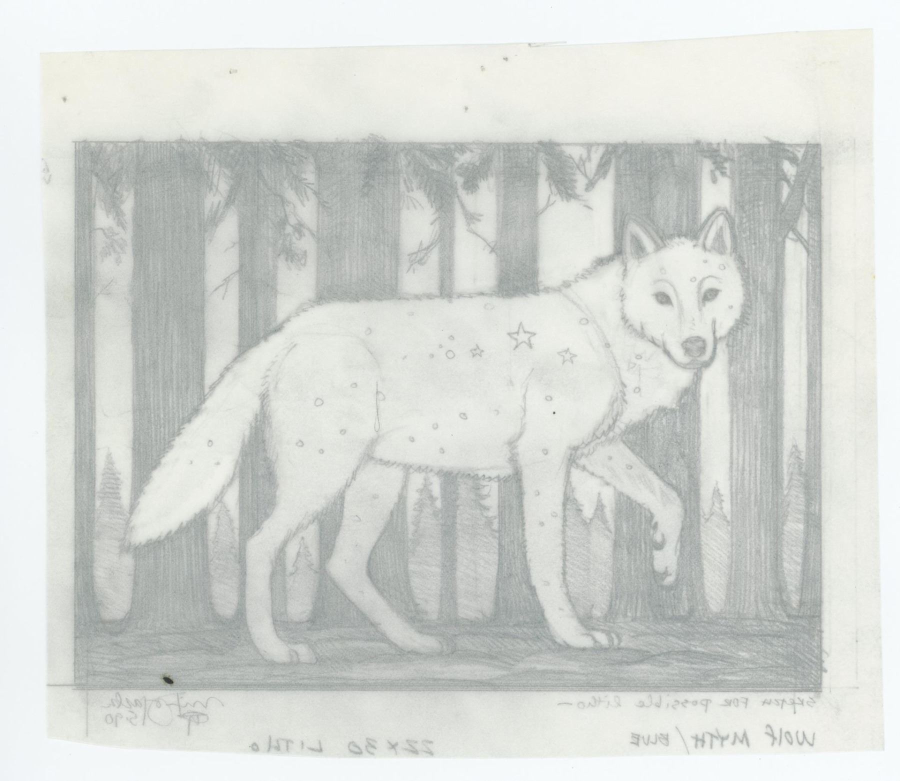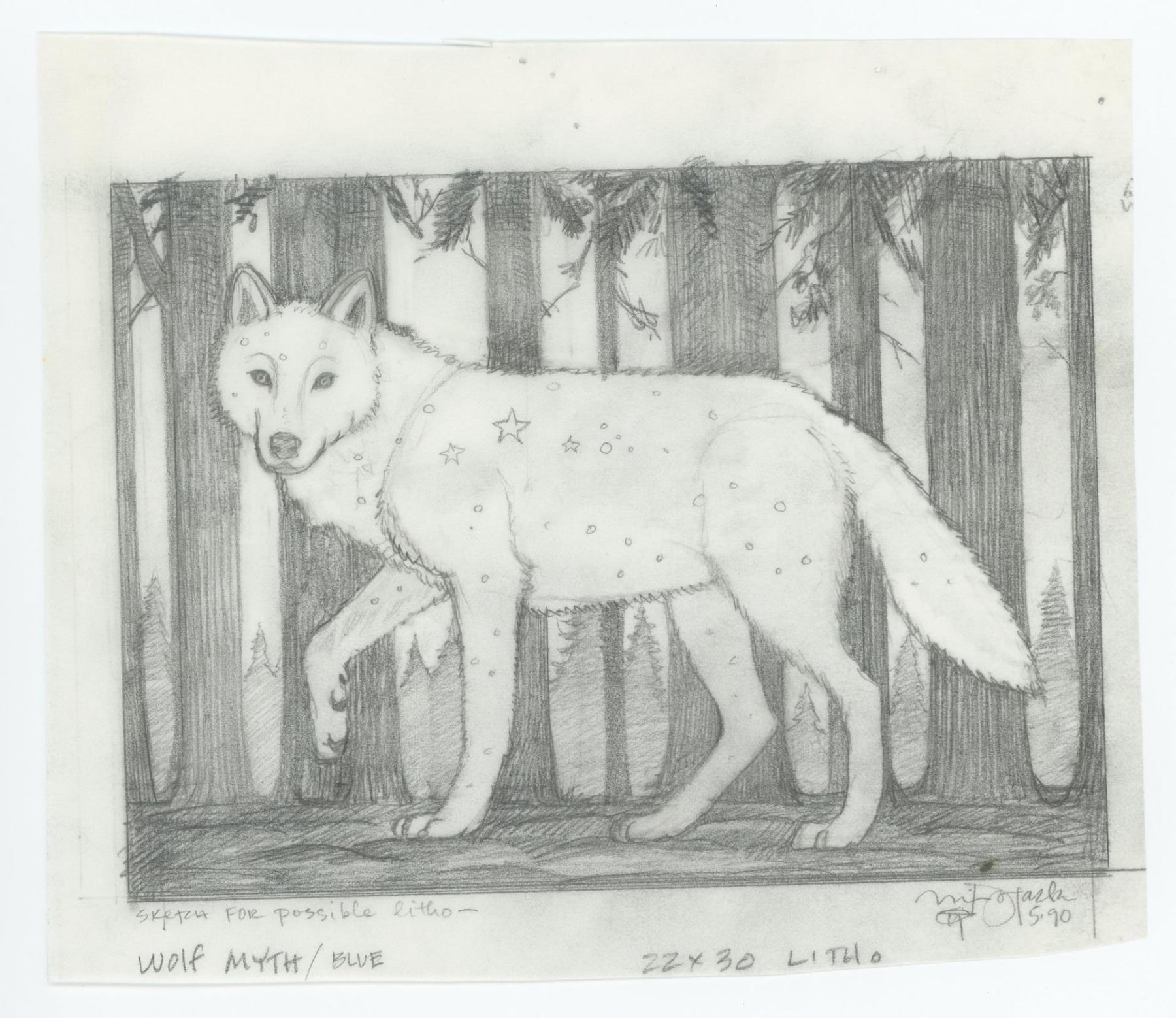 This is a study for a hand drawn lithograph titled Mystery At The Edge. 7 3/8" by 6 1/4" Monte Dolack (Born 1950) is active/lives in Montana. Monte Dolack is known for Poster illustration, landscape and wildlife painting. A native of Great Falls, Monte Dolack grew up surrounded by the same sweeping vistas and big sky that inspired Charlie Russell. His love of Montana and passion for the West's diverse landscapes and wildlife are evident in the images he creates and the commissions he undertakes. After studying art at Montana State University and The University of Montana, Monte opened his first studio in 1974, beginning a career in fine art and graphics. His best known early works - wild animals wreaking havoc in human homes - comprise his Invaders Series, exploring the myths of the West and how we view our relationship with our environment. The irresistible appeal of these images helped build Monte's national reputation and continues to attract collectors. Monte has been the recipient of a number of prestigious awards in the course of his career, and his work is part of the collection of the Library of Congress, the American Association of Museums, the National Wildfire Foundation and numerous other museums and corporations. Recent exhibitions include The Montana Exhibition, Manawatu Art Museum, New Zealand; Artists of the American West, Bank of Ireland Arts Centre, Dublin, Ireland, and The Kumamoto Prefectural Art Museum, Kumamoto, Japan. Monte's work was chosen to be included in The North American Print Biennial, Boston, MA and New American Paintings, a Western States competition sponsored by the Open Studio Press as well as five major museums in China including the National Art Museum of Bejing, as part of the New West Exhibition. In 2011 he exhibited at the Palace of Nations at the United Nations, Geneva Switzerland. He was selected at the turn of the century by the Missoulian as one of the 100 most influential Montanans of the twentieth century and recently received the distinguished Fine Arts Alumni Award from the University of Montana along with his wife, Mary Beth Percival. A love of the natural world, combined with his exuberant curiosity and travel experiences, has shaped the content of Monte's imagery. Blending mythology, technology and elements from nature, his work is infused with a sense of humor and irony. Monte's keen interest in environmental issues has lead to commissions for the Nature Conservancy, Defenders of Wildlife and Trout Unlimited as well as over 200 posters and prints for various organizations. In addition to his acrylic, oil and watercolor painting, Monte continues to pursue his interest in traditional printmaking, having created numerous original lithographs. Since 1993, with his wife, Mary Beth Percival and staff, he operates a flourishing gallery in downtown Missoula. Monte and Mary Beth have traveled extensively in the US, Europe, Mexico, New Zealand and Japan, visiting important cultural sites and museums and making paintings from their travels.