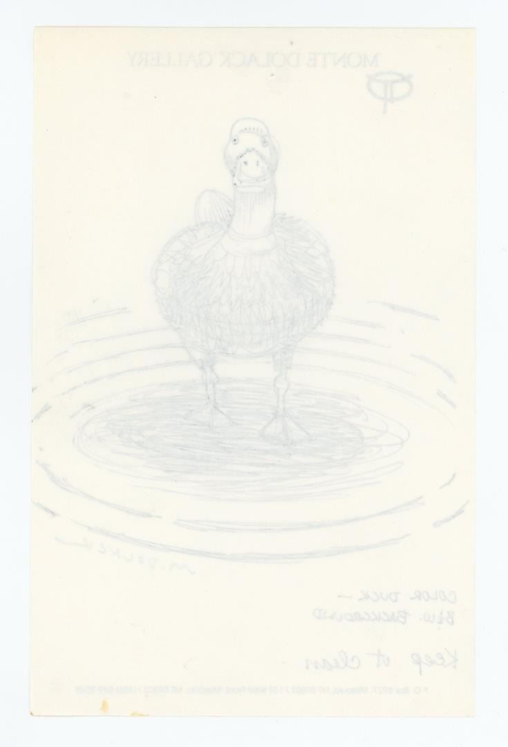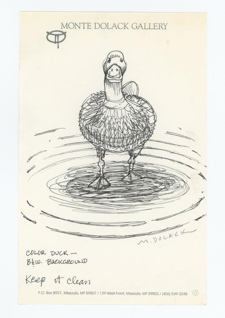 Untitled. Ink on gallery stationary. 8 1/2" by 5 1/2" Monte Dolack (Born 1950) is active/lives in Montana. Monte Dolack is known for Poster illustration, landscape and wildlife painting. A native of Great Falls, Monte Dolack grew up surrounded by the same sweeping vistas and big sky that inspired Charlie Russell. His love of Montana and passion for the West's diverse landscapes and wildlife are evident in the images he creates and the commissions he undertakes. After studying art at Montana State University and The University of Montana, Monte opened his first studio in 1974, beginning a career in fine art and graphics. His best known early works - wild animals wreaking havoc in human homes - comprise his Invaders Series, exploring the myths of the West and how we view our relationship with our environment. The irresistible appeal of these images helped build Monte's national reputation and continues to attract collectors. Monte has been the recipient of a number of prestigious awards in the course of his career, and his work is part of the collection of the Library of Congress, the American Association of Museums, the National Wildfire Foundation and numerous other museums and corporations. Recent exhibitions include The Montana Exhibition, Manawatu Art Museum, New Zealand; Artists of the American West, Bank of Ireland Arts Centre, Dublin, Ireland, and The Kumamoto Prefectural Art Museum, Kumamoto, Japan. Monte's work was chosen to be included in The North American Print Biennial, Boston, MA and New American Paintings, a Western States competition sponsored by the Open Studio Press as well as five major museums in China including the National Art Museum of Bejing, as part of the New West Exhibition. In 2011 he exhibited at the Palace of Nations at the United Nations, Geneva Switzerland. He was selected at the turn of the century by the Missoulian as one of the 100 most influential Montanans of the twentieth century and recently received the distinguished Fine Arts Alumni Award from the University of Montana along with his wife, Mary Beth Percival. A love of the natural world, combined with his exuberant curiosity and travel experiences, has shaped the content of Monte's imagery. Blending mythology, technology and elements from nature, his work is infused with a sense of humor and irony. Monte's keen interest in environmental issues has lead to commissions for the Nature Conservancy, Defenders of Wildlife and Trout Unlimited as well as over 200 posters and prints for various organizations. In addition to his acrylic, oil and watercolor painting, Monte continues to pursue his interest in traditional printmaking, having created numerous original lithographs. Since 1993, with his wife, Mary Beth Percival and staff, he operates a flourishing gallery in downtown Missoula. Monte and Mary Beth have traveled extensively in the US, Europe, Mexico, New Zealand and Japan, visiting important cultural sites and museums and making paintings from their travels.