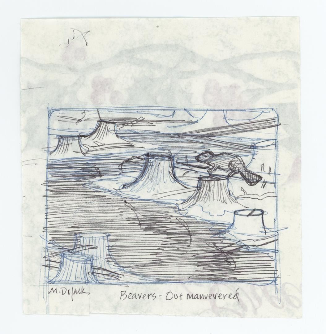 Title is Beavers- Out Manuevered. Ink on paper. 5 1/2" by 5" Monte Dolack (Born 1950) is active/lives in Montana. Monte Dolack is known for Poster illustration, landscape and wildlife painting. A native of Great Falls, Monte Dolack grew up surrounded by the same sweeping vistas and big sky that inspired Charlie Russell. His love of Montana and passion for the West's diverse landscapes and wildlife are evident in the images he creates and the commissions he undertakes. After studying art at Montana State University and The University of Montana, Monte opened his first studio in 1974, beginning a career in fine art and graphics. His best known early works - wild animals wreaking havoc in human homes - comprise his Invaders Series, exploring the myths of the West and how we view our relationship with our environment. The irresistible appeal of these images helped build Monte's national reputation and continues to attract collectors. Monte has been the recipient of a number of prestigious awards in the course of his career, and his work is part of the collection of the Library of Congress, the American Association of Museums, the National Wildfire Foundation and numerous other museums and corporations. Recent exhibitions include The Montana Exhibition, Manawatu Art Museum, New Zealand; Artists of the American West, Bank of Ireland Arts Centre, Dublin, Ireland, and The Kumamoto Prefectural Art Museum, Kumamoto, Japan. Monte's work was chosen to be included in The North American Print Biennial, Boston, MA and New American Paintings, a Western States competition sponsored by the Open Studio Press as well as five major museums in China including the National Art Museum of Bejing, as part of the New West Exhibition. In 2011 he exhibited at the Palace of Nations at the United Nations, Geneva Switzerland. He was selected at the turn of the century by the Missoulian as one of the 100 most influential Montanans of the twentieth century and recently received the distinguished Fine Arts Alumni Award from the University of Montana along with his wife, Mary Beth Percival. A love of the natural world, combined with his exuberant curiosity and travel experiences, has shaped the content of Monte's imagery. Blending mythology, technology and elements from nature, his work is infused with a sense of humor and irony. Monte's keen interest in environmental issues has lead to commissions for the Nature Conservancy, Defenders of Wildlife and Trout Unlimited as well as over 200 posters and prints for various organizations. In addition to his acrylic, oil and watercolor painting, Monte continues to pursue his interest in traditional printmaking, having created numerous original lithographs. Since 1993, with his wife, Mary Beth Percival and staff, he operates a flourishing gallery in downtown Missoula. Monte and Mary Beth have traveled extensively in the US, Europe, Mexico, New Zealand and Japan, visiting important cultural sites and museums and making paintings from their travels.