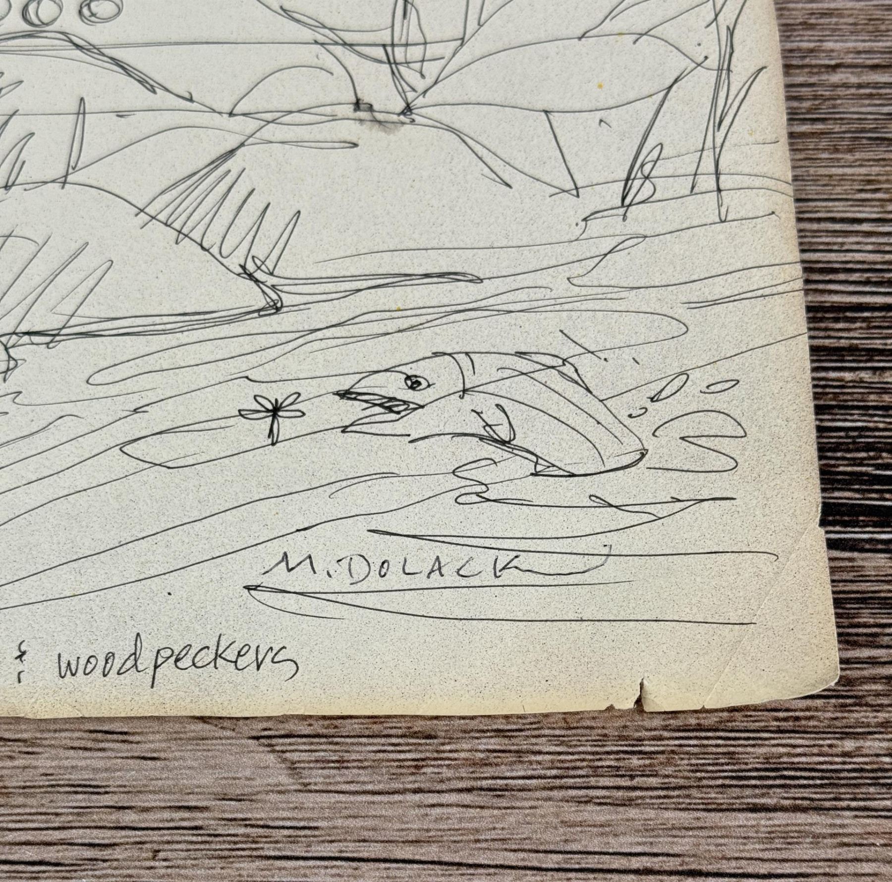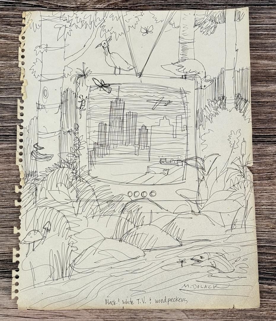 Appears to be an initial sketch for an inspiration the artist had titled Black & White TV & Woodpeckers, but it never came to fruition. 14" by 11" Monte Dolack (Born 1950) is active/lives in Montana. Monte Dolack is known for Poster illustration, landscape and wildlife painting. A native of Great Falls, Monte Dolack grew up surrounded by the same sweeping vistas and big sky that inspired Charlie Russell. His love of Montana and passion for the West's diverse landscapes and wildlife are evident in the images he creates and the commissions he undertakes. After studying art at Montana State University and The University of Montana, Monte opened his first studio in 1974, beginning a career in fine art and graphics. His best known early works - wild animals wreaking havoc in human homes - comprise his Invaders Series, exploring the myths of the West and how we view our relationship with our environment. The irresistible appeal of these images helped build Monte's national reputation and continues to attract collectors. Monte has been the recipient of a number of prestigious awards in the course of his career, and his work is part of the collection of the Library of Congress, the American Association of Museums, the National Wildfire Foundation and numerous other museums and corporations. Recent exhibitions include The Montana Exhibition, Manawatu Art Museum, New Zealand; Artists of the American West, Bank of Ireland Arts Centre, Dublin, Ireland, and The Kumamoto Prefectural Art Museum, Kumamoto, Japan. Monte's work was chosen to be included in The North American Print Biennial, Boston, MA and New American Paintings, a Western States competition sponsored by the Open Studio Press as well as five major museums in China including the National Art Museum of Bejing, as part of the New West Exhibition. In 2011 he exhibited at the Palace of Nations at the United Nations, Geneva Switzerland. He was selected at the turn of the century by the Missoulian as one of the 100 most influential Montanans of the twentieth century and recently received the distinguished Fine Arts Alumni Award from the University of Montana along with his wife, Mary Beth Percival. A love of the natural world, combined with his exuberant curiosity and travel experiences, has shaped the content of Monte's imagery. Blending mythology, technology and elements from nature, his work is infused with a sense of humor and irony. Monte's keen interest in environmental issues has lead to commissions for the Nature Conservancy, Defenders of Wildlife and Trout Unlimited as well as over 200 posters and prints for various organizations. In addition to his acrylic, oil and watercolor painting, Monte continues to pursue his interest in traditional printmaking, having created numerous original lithographs. Since 1993, with his wife, Mary Beth Percival and staff, he operates a flourishing gallery in downtown Missoula. Monte and Mary Beth have traveled extensively in the US, Europe, Mexico, New Zealand and Japan, visiting important cultural sites and museums and making paintings from their travels.