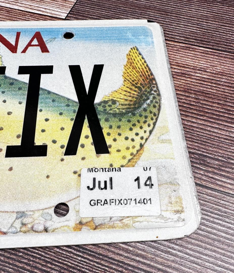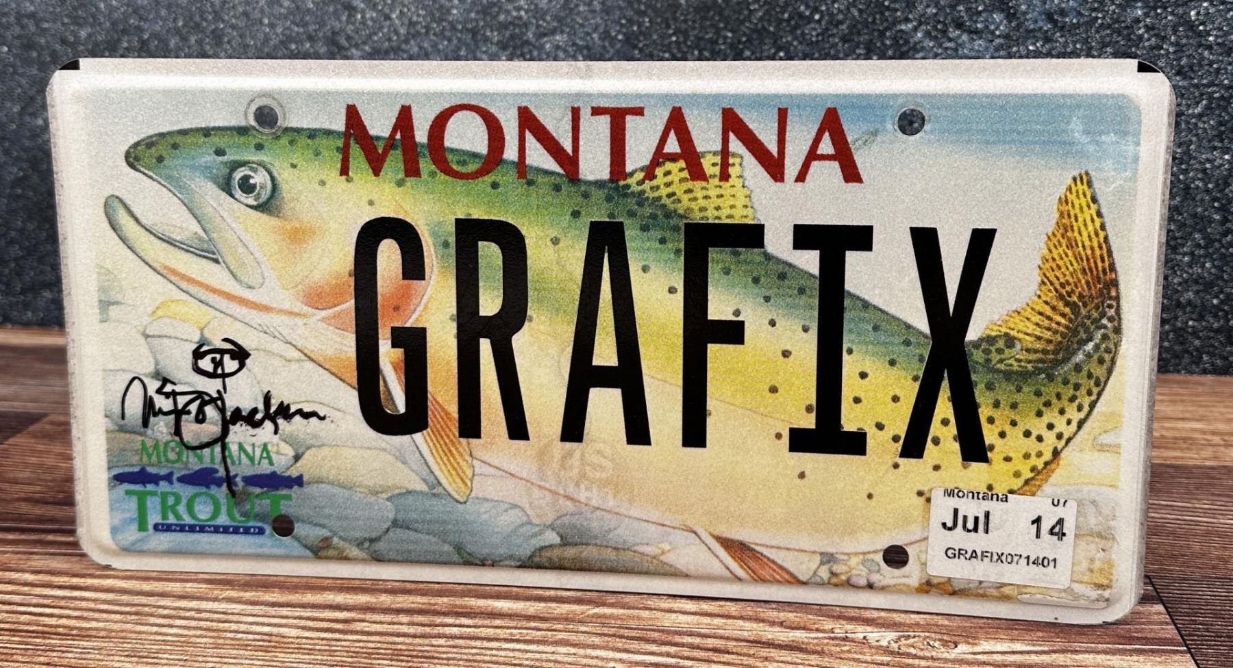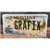 Autographed Custom Montana License Plate, as used and Designed by Monte Dolack. Monte Dolack (Born 1950) is active/lives in Montana. Monte Dolack is known for Poster illustration, landscape and wildlife painting. A native of Great Falls, Monte Dolack grew up surrounded by the same sweeping vistas and big sky that inspired Charlie Russell. His love of Montana and passion for the West's diverse landscapes and wildlife are evident in the images he creates and the commissions he undertakes. After studying art at Montana State University and The University of Montana, Monte opened his first studio in 1974, beginning a career in fine art and graphics. His best known early works - wild animals wreaking havoc in human homes - comprise his Invaders Series, exploring the myths of the West and how we view our relationship with our environment. The irresistible appeal of these images helped build Monte's national reputation and continues to attract collectors. Monte has been the recipient of a number of prestigious awards in the course of his career, and his work is part of the collection of the Library of Congress, the American Association of Museums, the National Wildfire Foundation and numerous other museums and corporations. Recent exhibitions include The Montana Exhibition, Manawatu Art Museum, New Zealand; Artists of the American West, Bank of Ireland Arts Centre, Dublin, Ireland, and The Kumamoto Prefectural Art Museum, Kumamoto, Japan. Monte's work was chosen to be included in The North American Print Biennial, Boston, MA and New American Paintings, a Western States competition sponsored by the Open Studio Press as well as five major museums in China including the National Art Museum of Bejing, as part of the New West Exhibition. In 2011 he exhibited at the Palace of Nations at the United Nations, Geneva Switzerland. He was selected at the turn of the century by the Missoulian as one of the 100 most influential Montanans of the twentieth century and recently received the distinguished Fine Arts Alumni Award from the University of Montana along with his wife, Mary Beth Percival. A love of the natural world, combined with his exuberant curiosity and travel experiences, has shaped the content of Monte's imagery. Blending mythology, technology and elements from nature, his work is infused with a sense of humor and irony. Monte's keen interest in environmental issues has lead to commissions for the Nature Conservancy, Defenders of Wildlife and Trout Unlimited as well as over 200 posters and prints for various organizations. In addition to his acrylic, oil and watercolor painting, Monte continues to pursue his interest in traditional printmaking, having created numerous original lithographs. Since 1993, with his wife, Mary Beth Percival and staff, he operates a flourishing gallery in downtown Missoula. Monte and Mary Beth have traveled extensively in the US, Europe, Mexico, New Zealand and Japan, visiting important cultural sites and museums and making paintings from their travels.