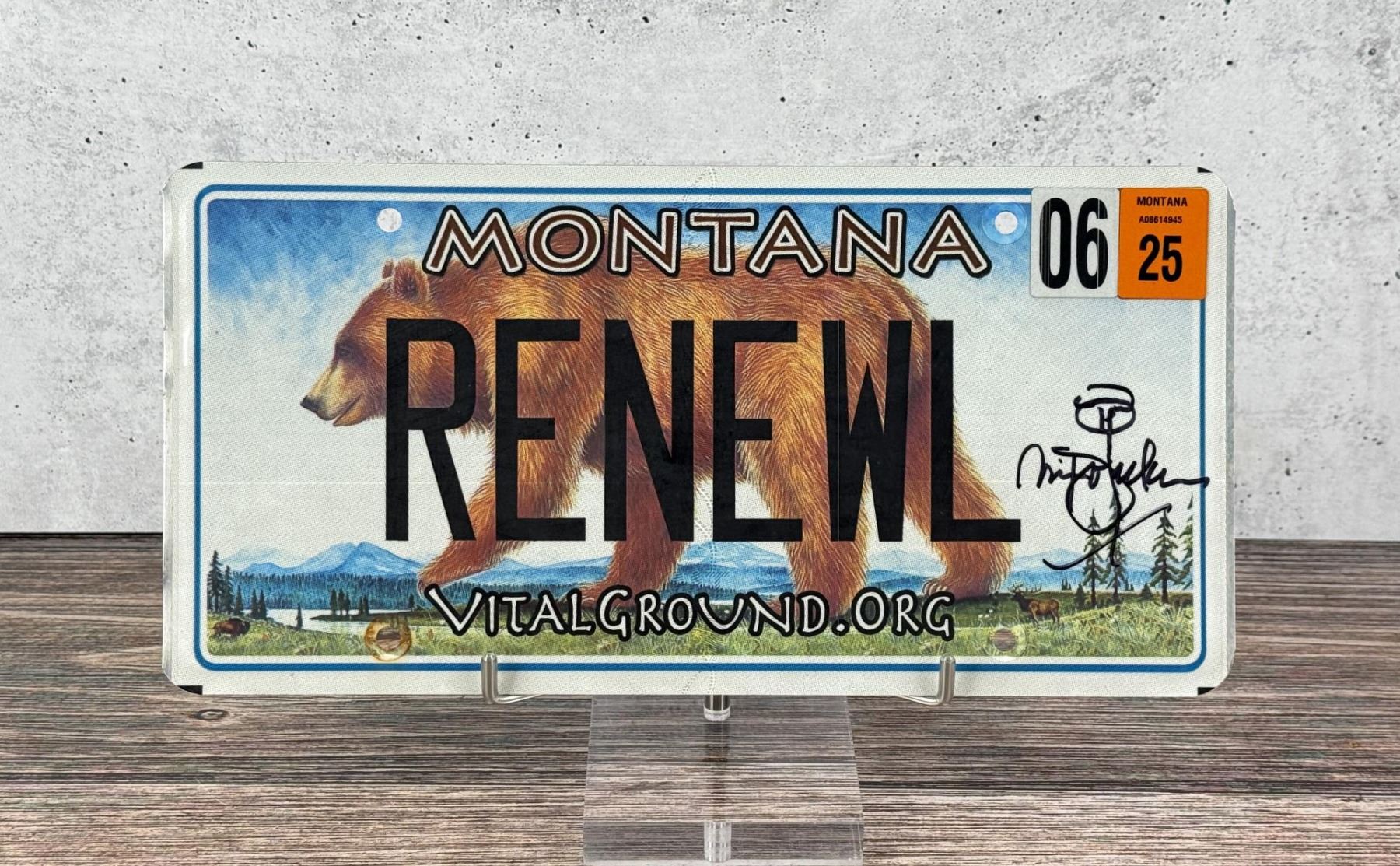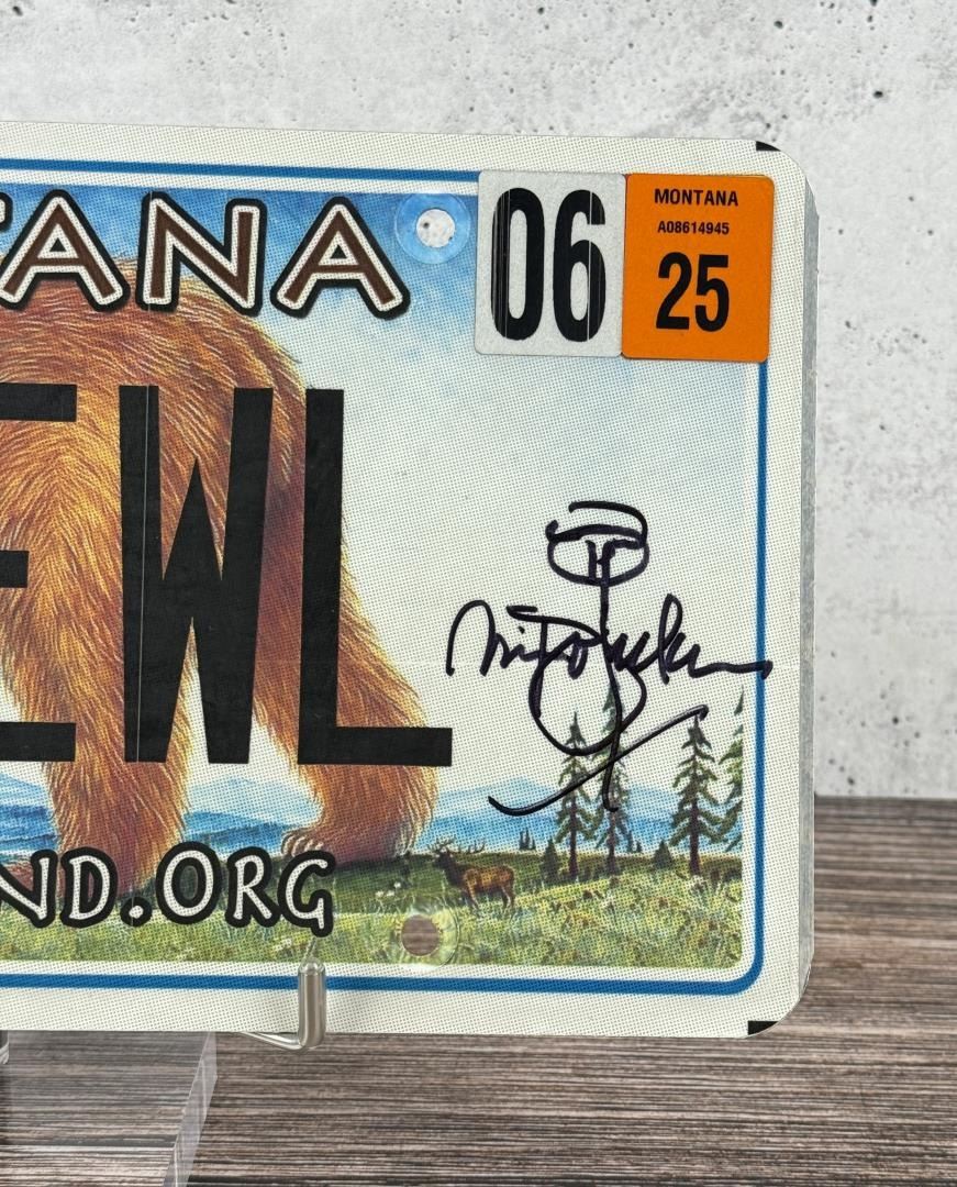 Autographed Custom Montana License Plate, as used and Designed by Monte Dolack. Monte Dolack (Born 1950) is active/lives in Montana. Monte Dolack is known for Poster illustration, landscape and wildlife painting. A native of Great Falls, Monte Dolack grew up surrounded by the same sweeping vistas and big sky that inspired Charlie Russell. His love of Montana and passion for the West's diverse landscapes and wildlife are evident in the images he creates and the commissions he undertakes. After studying art at Montana State University and The University of Montana, Monte opened his first studio in 1974, beginning a career in fine art and graphics. His best known early works - wild animals wreaking havoc in human homes - comprise his Invaders Series, exploring the myths of the West and how we view our relationship with our environment. The irresistible appeal of these images helped build Monte's national reputation and continues to attract collectors. Monte has been the recipient of a number of prestigious awards in the course of his career, and his work is part of the collection of the Library of Congress, the American Association of Museums, the National Wildfire Foundation and numerous other museums and corporations. Recent exhibitions include The Montana Exhibition, Manawatu Art Museum, New Zealand; Artists of the American West, Bank of Ireland Arts Centre, Dublin, Ireland, and The Kumamoto Prefectural Art Museum, Kumamoto, Japan. Monte's work was chosen to be included in The North American Print Biennial, Boston, MA and New American Paintings, a Western States competition sponsored by the Open Studio Press as well as five major museums in China including the National Art Museum of Bejing, as part of the New West Exhibition. In 2011 he exhibited at the Palace of Nations at the United Nations, Geneva Switzerland. He was selected at the turn of the century by the Missoulian as one of the 100 most influential Montanans of the twentieth century and recently received the distinguished Fine Arts Alumni Award from the University of Montana along with his wife, Mary Beth Percival. A love of the natural world, combined with his exuberant curiosity and travel experiences, has shaped the content of Monte's imagery. Blending mythology, technology and elements from nature, his work is infused with a sense of humor and irony. Monte's keen interest in environmental issues has lead to commissions for the Nature Conservancy, Defenders of Wildlife and Trout Unlimited as well as over 200 posters and prints for various organizations. In addition to his acrylic, oil and watercolor painting, Monte continues to pursue his interest in traditional printmaking, having created numerous original lithographs. Since 1993, with his wife, Mary Beth Percival and staff, he operates a flourishing gallery in downtown Missoula. Monte and Mary Beth have traveled extensively in the US, Europe, Mexico, New Zealand and Japan, visiting important cultural sites and museums and making paintings from their travels.