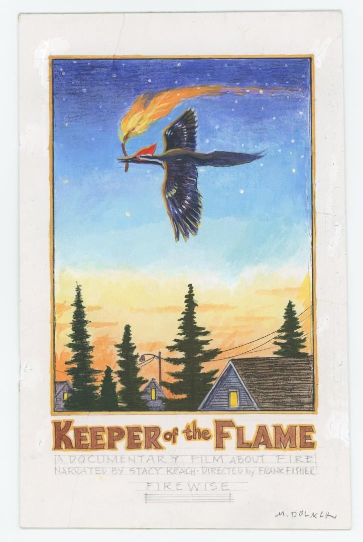 The working title for this piece was Keeper Of The Flame. It became Stealing Fire, an acrylic painting and poster commissioned by Systems For Enviromental Management. 8 5/8" by 5 1/2". Monte Dolack (Born 1950) is active/lives in Montana. Monte Dolack is known for Poster illustration, landscape and wildlife painting. A native of Great Falls, Monte Dolack grew up surrounded by the same sweeping vistas and big sky that inspired Charlie Russell. His love of Montana and passion for the West's diverse landscapes and wildlife are evident in the images he creates and the commissions he undertakes. After studying art at Montana State University and The University of Montana, Monte opened his first studio in 1974, beginning a career in fine art and graphics. His best known early works - wild animals wreaking havoc in human homes - comprise his Invaders Series, exploring the myths of the West and how we view our relationship with our environment. The irresistible appeal of these images helped build Monte's national reputation and continues to attract collectors. Monte has been the recipient of a number of prestigious awards in the course of his career, and his work is part of the collection of the Library of Congress, the American Association of Museums, the National Wildfire Foundation and numerous other museums and corporations. Recent exhibitions include The Montana Exhibition, Manawatu Art Museum, New Zealand; Artists of the American West, Bank of Ireland Arts Centre, Dublin, Ireland, and The Kumamoto Prefectural Art Museum, Kumamoto, Japan. Monte's work was chosen to be included in The North American Print Biennial, Boston, MA and New American Paintings, a Western States competition sponsored by the Open Studio Press as well as five major museums in China including the National Art Museum of Bejing, as part of the New West Exhibition. In 2011 he exhibited at the Palace of Nations at the United Nations, Geneva Switzerland. He was selected at the turn of the century by the Missoulian as one of the 100 most influential Montanans of the twentieth century and recently received the distinguished Fine Arts Alumni Award from the University of Montana along with his wife, Mary Beth Percival. A love of the natural world, combined with his exuberant curiosity and travel experiences, has shaped the content of Monte's imagery. Blending mythology, technology and elements from nature, his work is infused with a sense of humor and irony. Monte's keen interest in environmental issues has lead to commissions for the Nature Conservancy, Defenders of Wildlife and Trout Unlimited as well as over 200 posters and prints for various organizations. In addition to his acrylic, oil and watercolor painting, Monte continues to pursue his interest in traditional printmaking, having created numerous original lithographs. Since 1993, with his wife, Mary Beth Percival and staff, he operates a flourishing gallery in downtown Missoula. Monte and Mary Beth have traveled extensively in the US, Europe, Mexico, New Zealand and Japan, visiting important cultural sites and museums and making paintings from their travels.