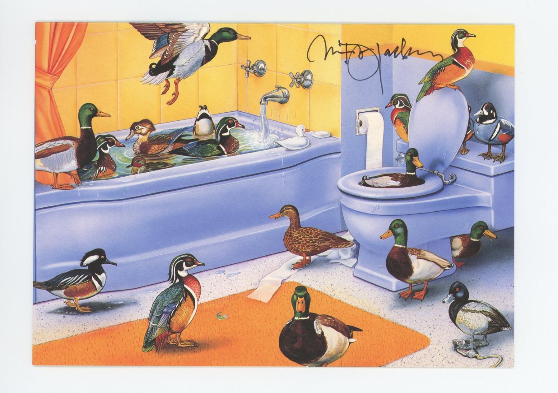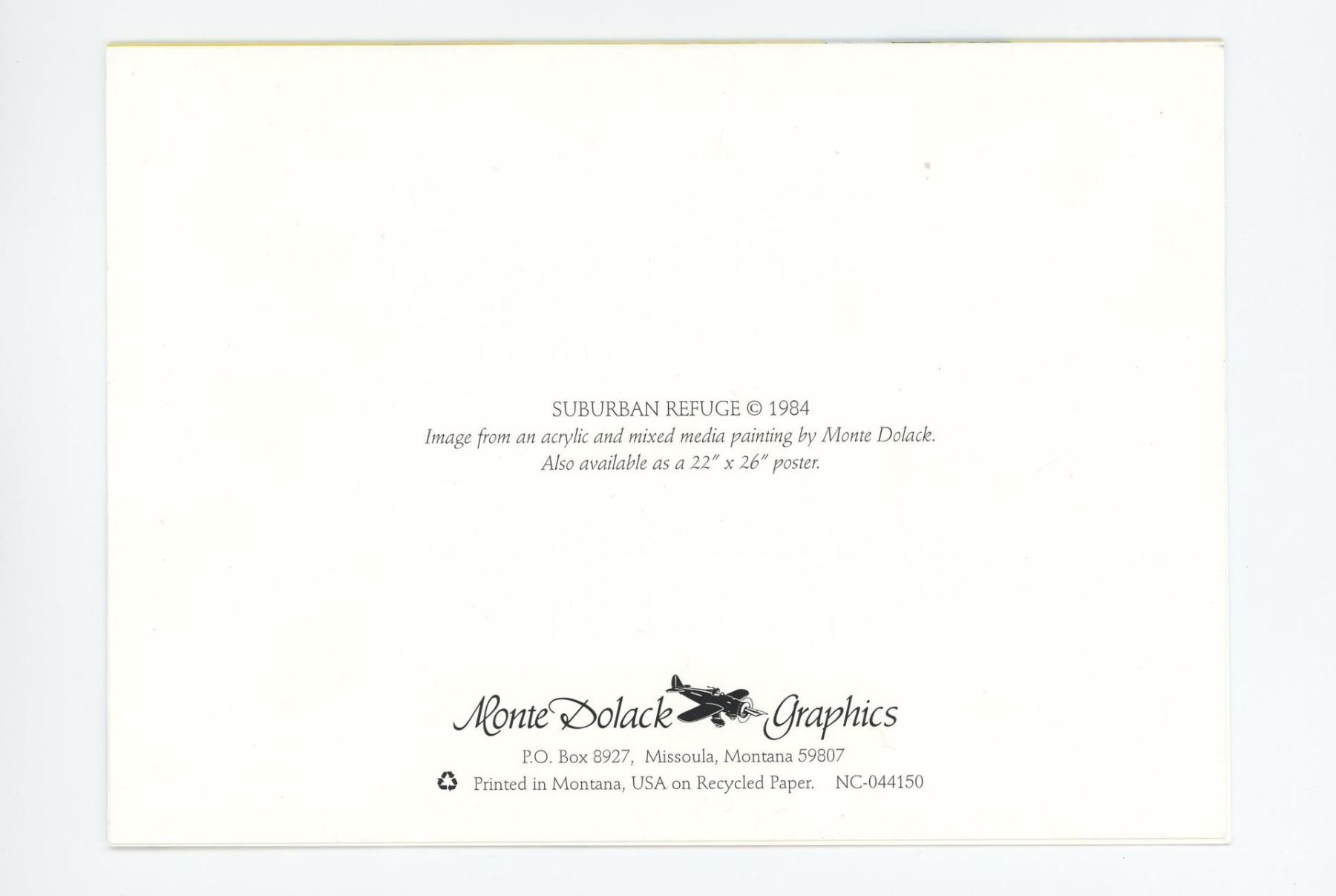 7" by 5" closed. Monte Dolack (Born 1950) is active/lives in Montana. Monte Dolack is known for Poster illustration, landscape and wildlife painting. A native of Great Falls, Monte Dolack grew up surrounded by the same sweeping vistas and big sky that inspired Charlie Russell. His love of Montana and passion for the West's diverse landscapes and wildlife are evident in the images he creates and the commissions he undertakes. After studying art at Montana State University and The University of Montana, Monte opened his first studio in 1974, beginning a career in fine art and graphics. His best known early works - wild animals wreaking havoc in human homes - comprise his Invaders Series, exploring the myths of the West and how we view our relationship with our environment. The irresistible appeal of these images helped build Monte's national reputation and continues to attract collectors. Monte has been the recipient of a number of prestigious awards in the course of his career, and his work is part of the collection of the Library of Congress, the American Association of Museums, the National Wildfire Foundation and numerous other museums and corporations. Recent exhibitions include The Montana Exhibition, Manawatu Art Museum, New Zealand; Artists of the American West, Bank of Ireland Arts Centre, Dublin, Ireland, and The Kumamoto Prefectural Art Museum, Kumamoto, Japan. Monte's work was chosen to be included in The North American Print Biennial, Boston, MA and New American Paintings, a Western States competition sponsored by the Open Studio Press as well as five major museums in China including the National Art Museum of Bejing, as part of the New West Exhibition. In 2011 he exhibited at the Palace of Nations at the United Nations, Geneva Switzerland. He was selected at the turn of the century by the Missoulian as one of the 100 most influential Montanans of the twentieth century and recently received the distinguished Fine Arts Alumni Award from the University of Montana along with his wife, Mary Beth Percival. A love of the natural world, combined with his exuberant curiosity and travel experiences, has shaped the content of Monte's imagery. Blending mythology, technology and elements from nature, his work is infused with a sense of humor and irony. Monte's keen interest in environmental issues has lead to commissions for the Nature Conservancy, Defenders of Wildlife and Trout Unlimited as well as over 200 posters and prints for various organizations. In addition to his acrylic, oil and watercolor painting, Monte continues to pursue his interest in traditional printmaking, having created numerous original lithographs. Since 1993, with his wife, Mary Beth Percival and staff, he operates a flourishing gallery in downtown Missoula. Monte and Mary Beth have traveled extensively in the US, Europe, Mexico, New Zealand and Japan, visiting important cultural sites and museums and making paintings from their travels.