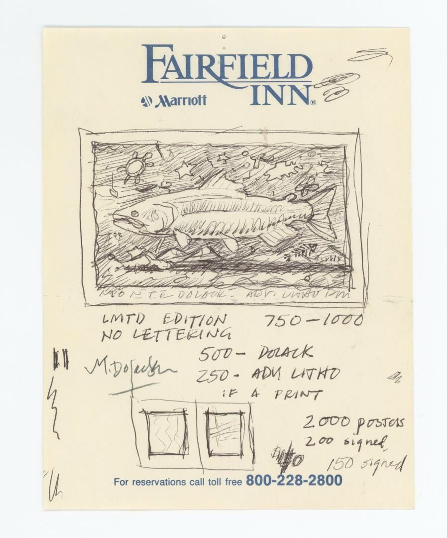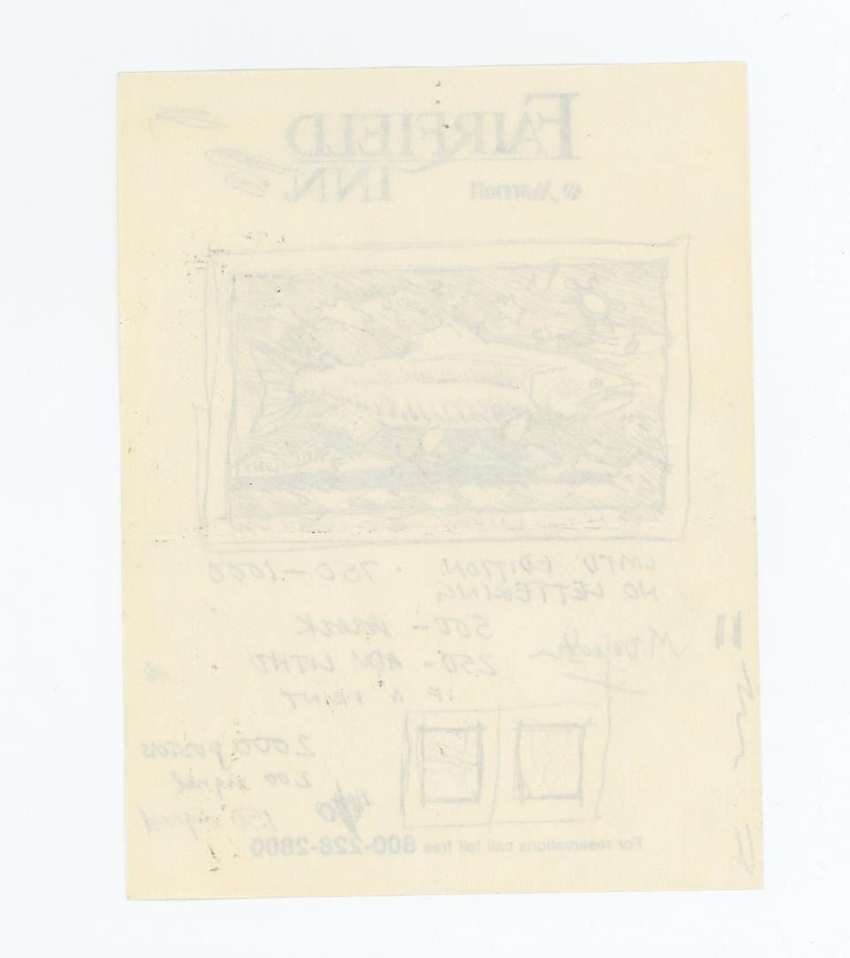 Untitled. Ink on a piece of Fairfield Inn note paper. It appears this idea never came to fruition. 5 1/2" by 4 1/8". Monte Dolack (Born 1950) is active/lives in Montana. Monte Dolack is known for Poster illustration, landscape and wildlife painting. A native of Great Falls, Monte Dolack grew up surrounded by the same sweeping vistas and big sky that inspired Charlie Russell. His love of Montana and passion for the West's diverse landscapes and wildlife are evident in the images he creates and the commissions he undertakes. After studying art at Montana State University and The University of Montana, Monte opened his first studio in 1974, beginning a career in fine art and graphics. His best known early works - wild animals wreaking havoc in human homes - comprise his Invaders Series, exploring the myths of the West and how we view our relationship with our environment. The irresistible appeal of these images helped build Monte's national reputation and continues to attract collectors. Monte has been the recipient of a number of prestigious awards in the course of his career, and his work is part of the collection of the Library of Congress, the American Association of Museums, the National Wildfire Foundation and numerous other museums and corporations. Recent exhibitions include The Montana Exhibition, Manawatu Art Museum, New Zealand; Artists of the American West, Bank of Ireland Arts Centre, Dublin, Ireland, and The Kumamoto Prefectural Art Museum, Kumamoto, Japan. Monte's work was chosen to be included in The North American Print Biennial, Boston, MA and New American Paintings, a Western States competition sponsored by the Open Studio Press as well as five major museums in China including the National Art Museum of Bejing, as part of the New West Exhibition. In 2011 he exhibited at the Palace of Nations at the United Nations, Geneva Switzerland. He was selected at the turn of the century by the Missoulian as one of the 100 most influential Montanans of the twentieth century and recently received the distinguished Fine Arts Alumni Award from the University of Montana along with his wife, Mary Beth Percival. A love of the natural world, combined with his exuberant curiosity and travel experiences, has shaped the content of Monte's imagery. Blending mythology, technology and elements from nature, his work is infused with a sense of humor and irony. Monte's keen interest in environmental issues has lead to commissions for the Nature Conservancy, Defenders of Wildlife and Trout Unlimited as well as over 200 posters and prints for various organizations. In addition to his acrylic, oil and watercolor painting, Monte continues to pursue his interest in traditional printmaking, having created numerous original lithographs. Since 1993, with his wife, Mary Beth Percival and staff, he operates a flourishing gallery in downtown Missoula. Monte and Mary Beth have traveled extensively in the US, Europe, Mexico, New Zealand and Japan, visiting important cultural sites and museums and making paintings from their travels.