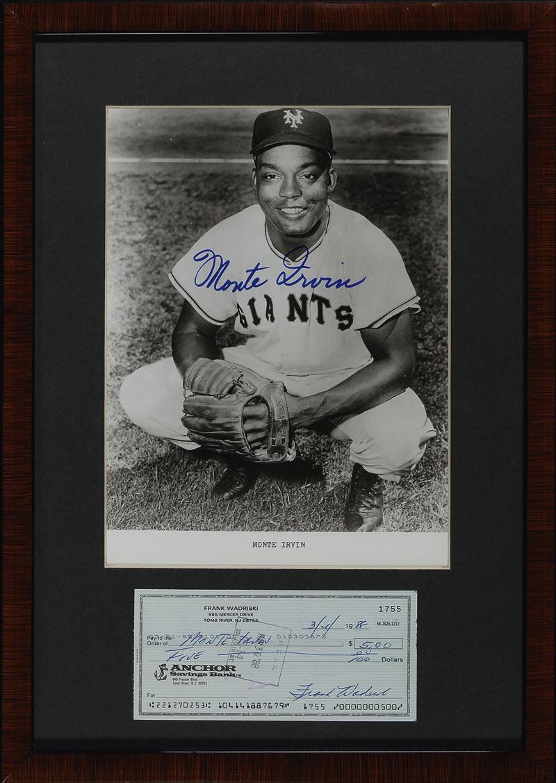 Glossy 8 x 10 photo of Irvin in his Giants uniform, signed in blue felt tip. Matted and framed with a check from 1988 payable to Irvin, to an overall size of 12 x 17. In very fine condition. Pre-certified Steve Grad/PSA/DNA and RRAuction COA.