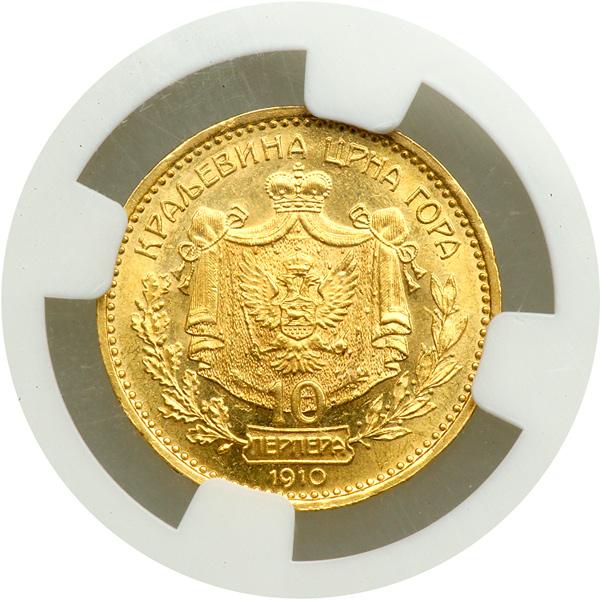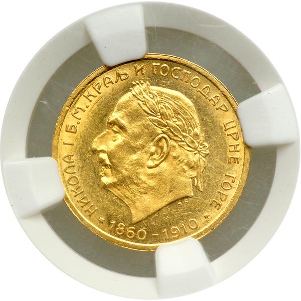 Montenegro. 10 Perpera, 1910. Fr-6; KM-9. Nicholas I, 1860-1918. Laureate head to left. Reverse: Crowned Arms. On the 50th year of both his reign and marriage. NGC graded MS-62.
