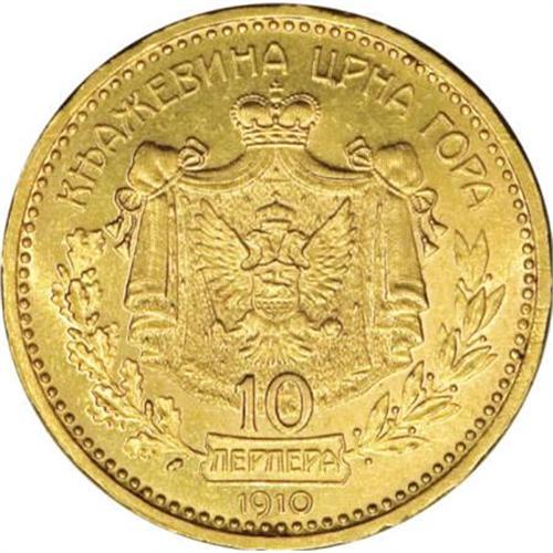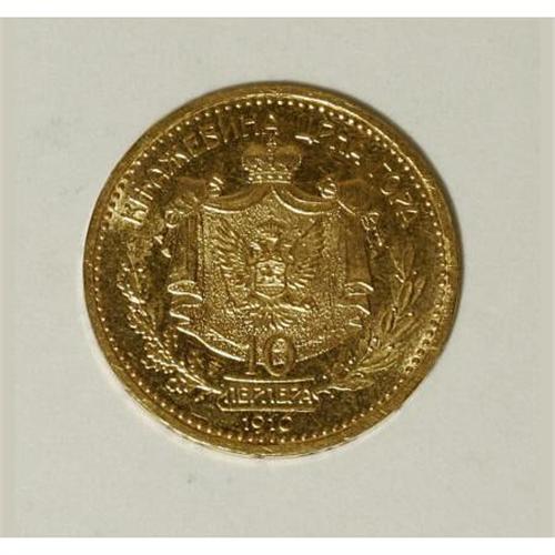 <B>Nicholas I gold 10 Perpera 1910,</B></I> KM8, bust right, brilliant AU-UNC, prooflike surfaces on the reverse, a very attractive example.<BR><BR><b>Shipping:</b> Coins & Currency (<a target="_blank" href="http://www.heritageauctions.com/common/shipping.php">view shipping information</a>)