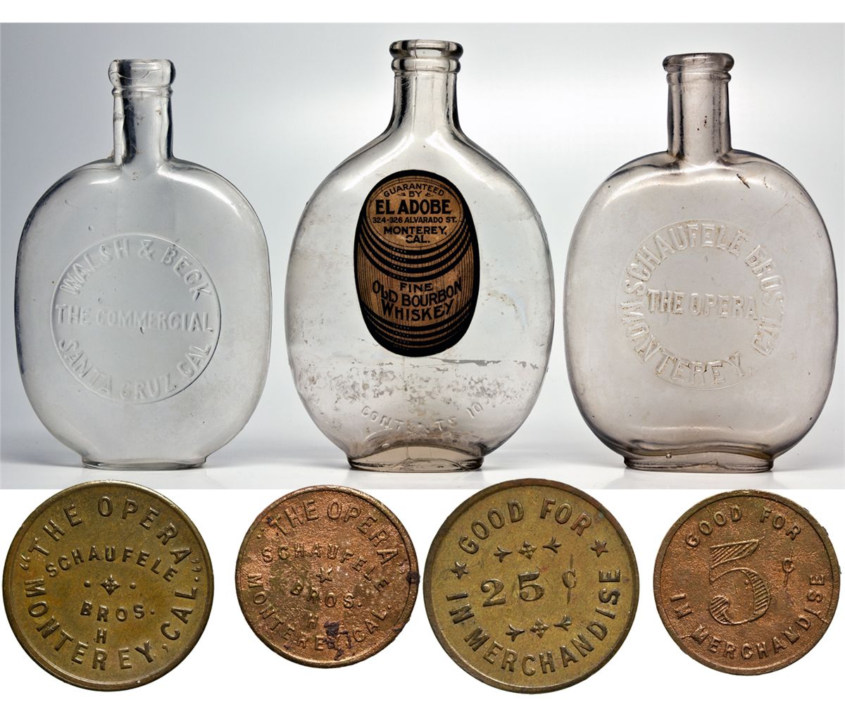 Lot of 5: 1) Slug marked SCHAUFELE BROS. THE OPERA, MONTEREY, CAL. on this ounce, clear picnic with footed base from this Monterey establishment. This piece has a neatly applied single collar, un-ground top, has air vent holes on each shoulder and is free of damage. 2,3) Also part of this set are two tokens. There is a "Good for 25 Cents in Trade" and a "Good for Five Cents in Trade" piece. Both tokens in good condition. Not listed in Thomas. 4) Slug inscribed WALSH & BECK THE COMMERCIAL SANTA CRUZ, CAL. on this one ounce clear, picnic style, with footed base (small chip), neatly applied single collar, un-ground top and two air vents on shoulders. There is a long crack/scratch on reverse and a small crack/scratch in front, above slug plate. This saloon was run by partners Walsh and Beck and was in existence by 1905. It was located at 124 Pacific Ave. and closed down because of Prohibition in 1918. 5) Paper label inscribed GUARANTEED BY EL ADOBE 324-326 ALVARDO ST. MONTEREY, CAL. FINE BOURBON WHISKEY on this 10 ounce bottle with a footed base (a small chip). Top is a single collar un-ground top with no damage. There are air vents on the shoulders and some air bubbles evident. Not listed in either Thomas or Wilson. - Feisel Collection -59302