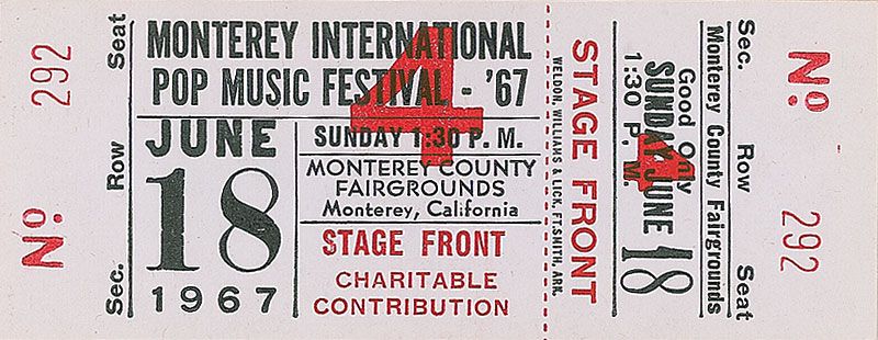 Two items: one original unused ticket, 3.5 x 1.5, for the 1:30 pm, June 18 session of the 1967 Monterey International Pop Music Festival; and one bi-fold business card, 3.5 x 2, featuring the festival’s logo on the front and production supervisor Alan Pariser’s contact information inside. In overall very fine condition.