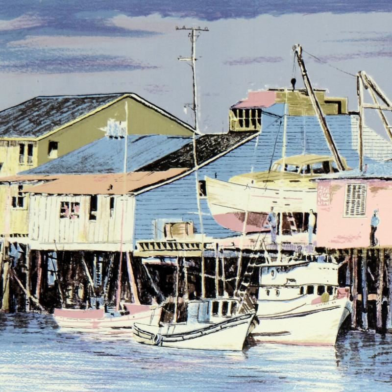 "Monterey Wharf" is a limited edition serigraph on paper by William Nelson, numbered and hand signed by the artist! Measures approx. 29" x 22" (with border); 25" x 18" (image).