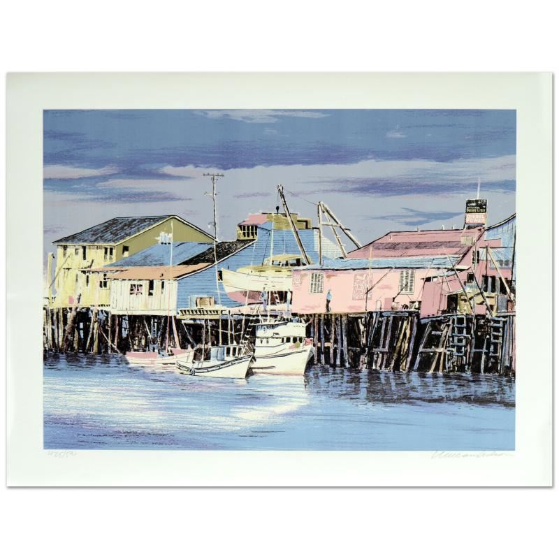 "Monterey Wharf" is a limited edition serigraph on paper by William Nelson, numbered and hand signed by the artist! Measures approx. 29" x 22" (with border); 25" x 18" (image).