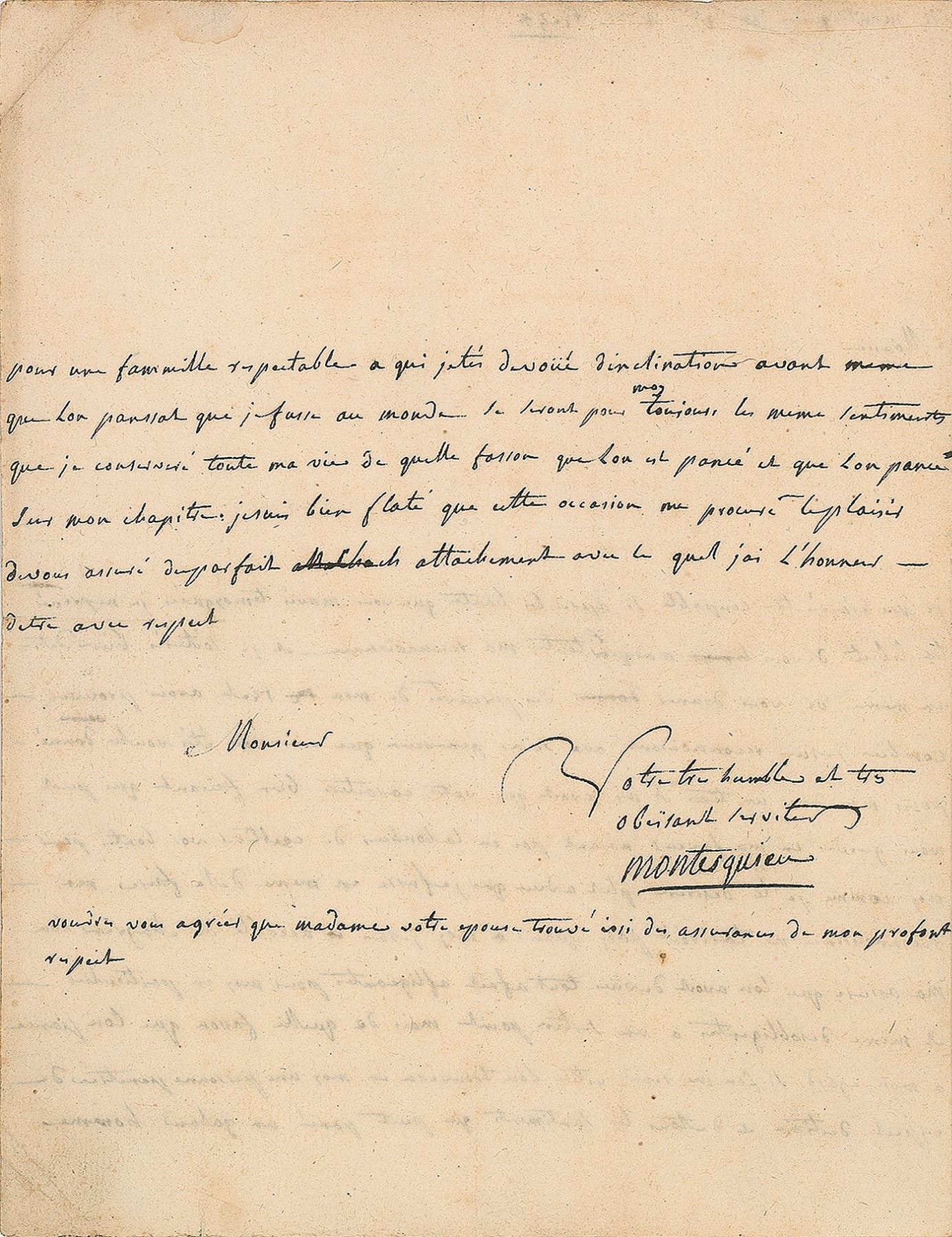 French lawyer, man of letters, and political philosopher who lived during the Age of Enlightenment (1689–1755), best known for his theory of the separation of powers—today a founding principle of many liberal constitutions throughout the world. Extremely rare ALS in French, signed “Montesquieu,” one page both sides, 6.75 x 8.75, October 9, 1748. Letter to the Marquis de Palarin, one of his main friends and protectors, in part (translated): "I would wish to be…giving proof of how grateful I am for the generous solicitude that you have been willing to extend to me at a time when only your beneficent character could guide you to favor me." In fine condition, with creases to the corners, and seal-related paper loss to the integral address leaf. ALSs by Montesquieu are incredibly rare, as he is typically only found in LSs. A truly exquisite piece.