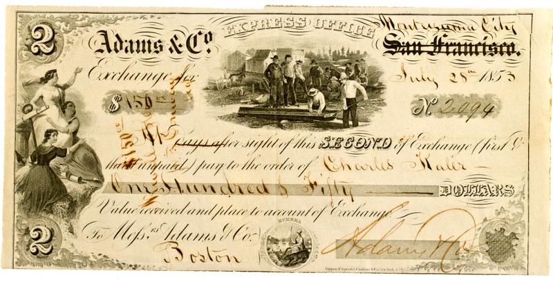 No.2094. This is a rare Second of Exchange dated July 28, 1853. Datelined San Francisco, marked out and Montezuma City hand written above. Payable "at sight" ("days after" lined out) to Charles Haler for $150, its destination was the Boston office. Vertical writing in brown on front appears to be "$150, Newell, (illegible)." Printers: Toppan, Carpenter, Casilear & Co., New York & Philadelphia. Printed on light blue paper with 1/2" tear in upper and lower right corners. Montezuma City was located in Tuolumne County, and was a significant gold rush town from the 1850’s through the 1880’s. Large nuggets were found there, and documents from this gold rush camp are exceptionally rare. The vignette on this exchange is among the most collectible of Adams & Co. because of the sluice box in the miners’ scene at the top center. This piece is an R8 and to the best of my recollection and knowledge, it is the only one I have seen in 30 years, extremely fine. Type II, Variety IIC.