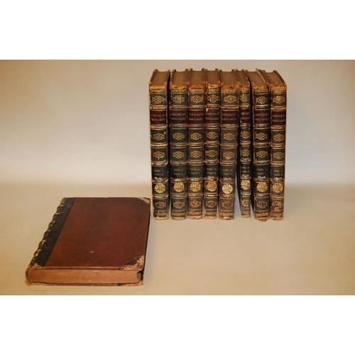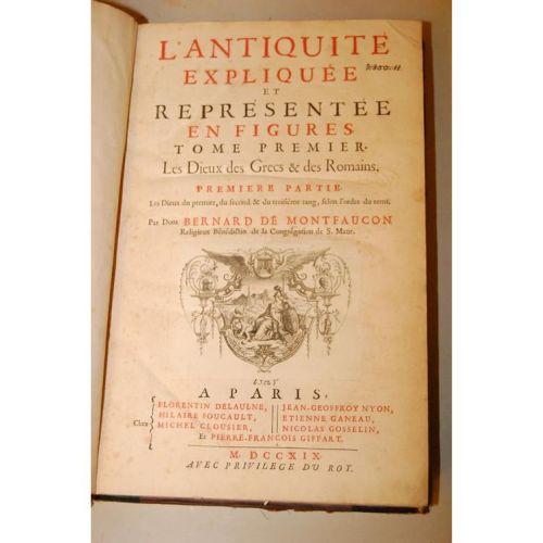 Montfaucon, Bernard De. L'Antiquite Expliquee Et Representee En Figures - 5 Volumes in 9 (of 10) Volumes. Paris: Florentin Delaulne & Others, 1719. First Edition. Elephant Folio - over 15" - 23" tall. Hard Cover. Ex-Library. Good Condition. With 885 engraved plates, of which 132 are double page, of which 7 are folding. Bound in 3/4 leather & silk moire, raised bands on spines, maroon spine labels. Title pages in red & black with title vignettes, chapter vignettes, head & tail pieces, flourished initials, historiated intitials. Lacks Volume 2/part 2. Occasional foxing, occasional closed tear on page. Binding & hinges tight. Covers show edge/corner wear, occasional loss to silk.