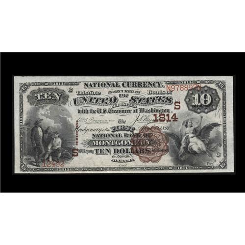 <B>Montgomery, AL</B></I> - $10 1882 Brown Back Fr. 484 <B>The First NB </B></I> Ch. # (S)1814<BR>This pleasing state capital note has nice sizeable margins and excellent colors, but suffers from faded signatures.