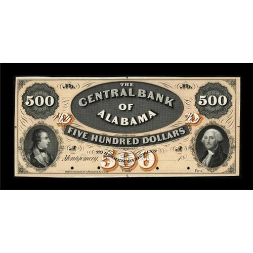 <B>Montgomery, AL- Central Bank of Alabama</B></I> $500 G28a Rosene UNL Proof<BR> A gorgeous fully orange tinted high denomination Proof, ex-ABNCo sale and Ford collection. <B>Uncirculated,</B></I> 4 POC, a fully margined piece worthy of the finest of collections. <BR><I>From The Collection of a Louisiana Gentleman.</B></I><BR><BR><b>Shipping:</b> Coins & Currency (<a target="_blank" href="http://www.heritageauctions.com/common/shipping.php">view shipping information</a>)