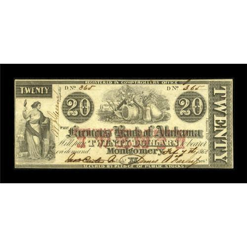 <B>Montgomery, AL- Farmers Bank of Alabama </B></I>$20 Feb. 7, 1862 G12a Rosene 237-3<BR> A lovely example of this scarcer denomination. <B>Uncirculated,</B></I> with a bright red overprint, a most attractive Manouvrier product. <BR><I>From The Collection of a Louisiana Gentleman.</B></I><BR><BR><b>Shipping:</b> Coins & Currency (<a target="_blank" href="http://www.heritageauctions.com/common/shipping.php">view shipping information</a>)
