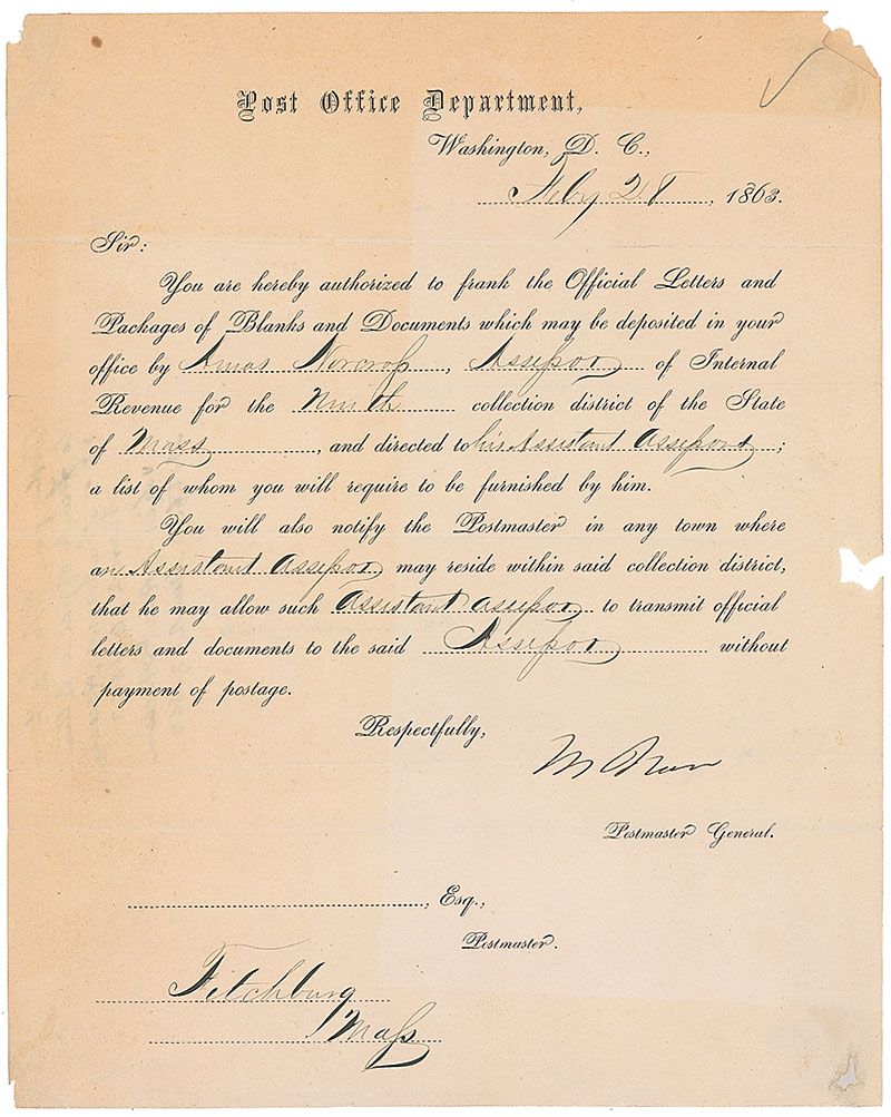 Lawyer who served in Lincoln’s cabinet as postmaster general (1813–1883). Civil War–dated partly-printed DS, signed “M. Blair,” one page, 7.75 x 9.75, February 28, 1863. Blair authorizes a gentleman “to frank Official Letters and Packages of Blanks and Documents which may be deposited in your office by Amos Norcross, Assessor of Internal Revenue.” In very good condition, with multiple horizontal storage folds, various irregular blocks of toning, and some small areas of paper loss to corners and edges.