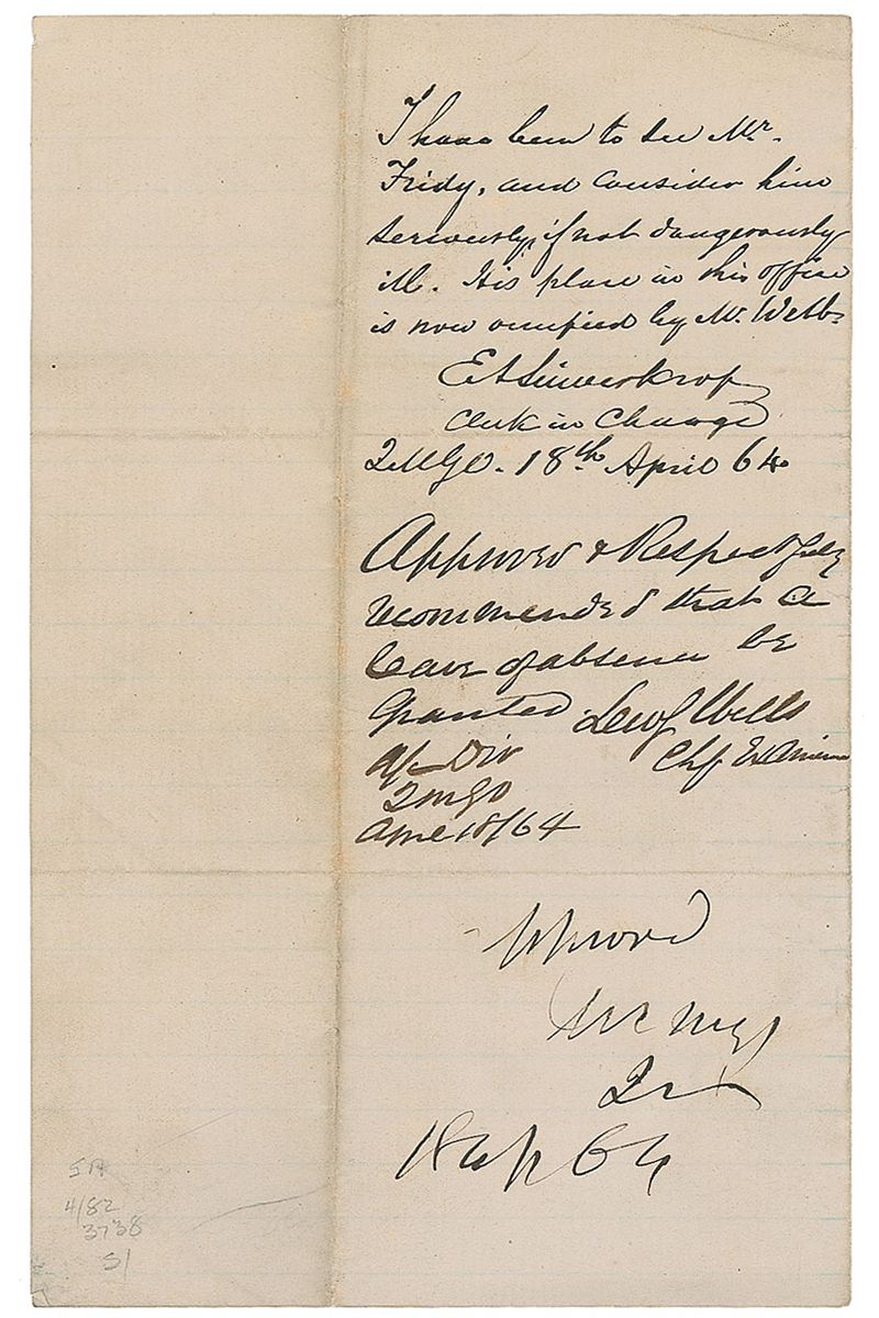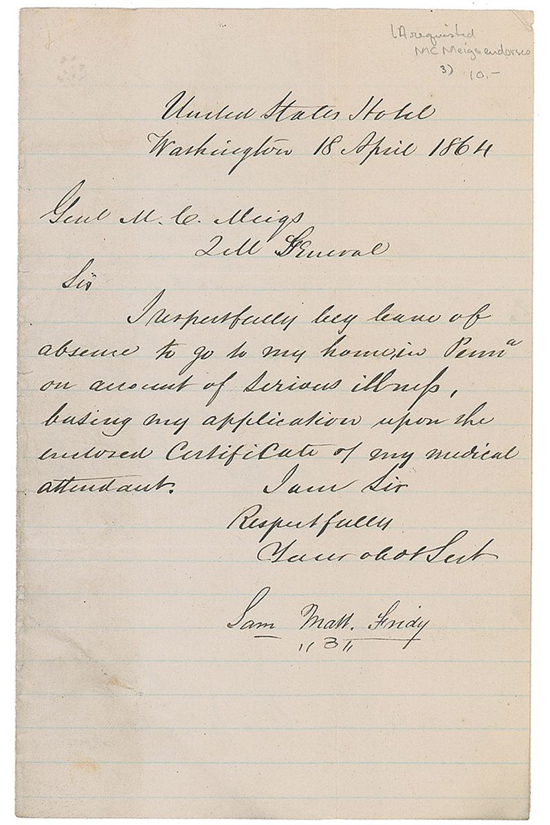 Career US Army officer, civil engineer, construction engineer for a number of facilities in Washington, DC, and quartermaster general of the US Army during and after the American Civil War (1816–1892). War-dated handwritten endorsement, signed “M. C. Meigs,” on the reverse of an April 18, 1864, letter to Meigs from a soldier requesting a leave of absence “on account of serious illness.” Endorsed on the reverse, “approved, M. C. Meigs, Gen, 18 ap 64.” Reverse also bears two other endorsements, with one referring to the soldier as “seriously, if not dangerously ill.” In very good condition, with intersecting folds, Meigs’s signature hurried, and some scattered light soiling.