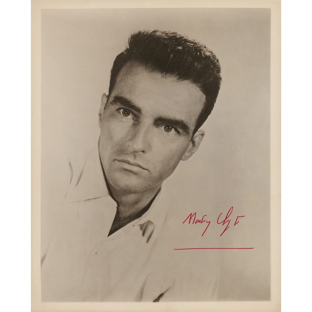 Handsome vintage matte-finish 8 x 10 head-and-shoulders photo of the sensitive movie star, signed in red ballpoint, "Monty Clift." In very fine condition.