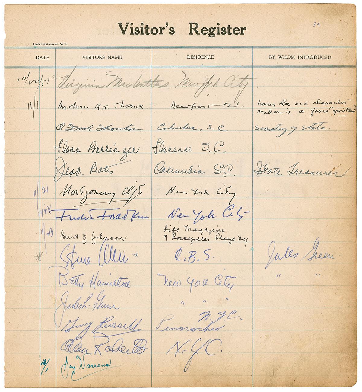 Highly regarded American actor (1920–1966) best known for his Oscar-nominated turns in such classics as Judgment at Nuremberg, From Here to Eternity, and A Place in the Sun. A 1956 car accident which left him disfigured set him on a downward spiral of substance abuse that earned him a reputation for unreliability and led to his death at the age of 45. Vintage lined guest register page, 11 x 12, signed on the front in black ink, “Montgomery Clift, New York City,” and dated in another hand November 21, 1951. The register is also signed on both sides by an addition 27 people, including Steve Allen. In very good condition, with moderate toning and soiling, primarily to edges, light show-through and impressions from signatures on reverse, and a rough left edge from removal.