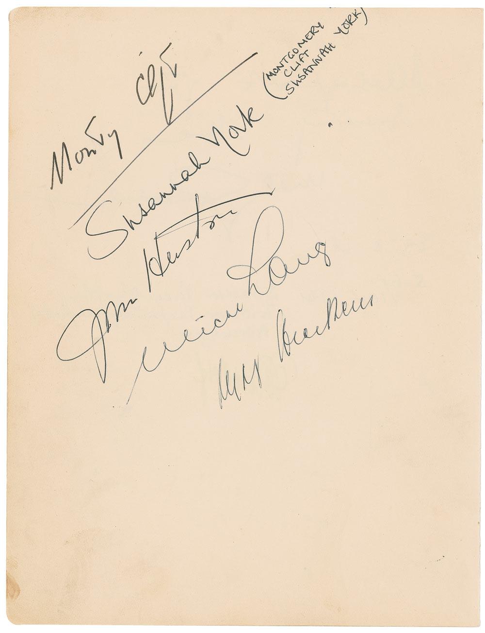 Vintage ink signature, “Monty Clift,” on an off-white 7.5 x 9.75 guest book page from the Hotel Grunwalder Weinbauer restaurant in Munich, Germany. Page is also signed by Susannah York and John Huston. In fine condition, with some scattered light toning and soiling. Consignor notes signatures were acquired at the restaurant in 1961 during the making of the film Freud.