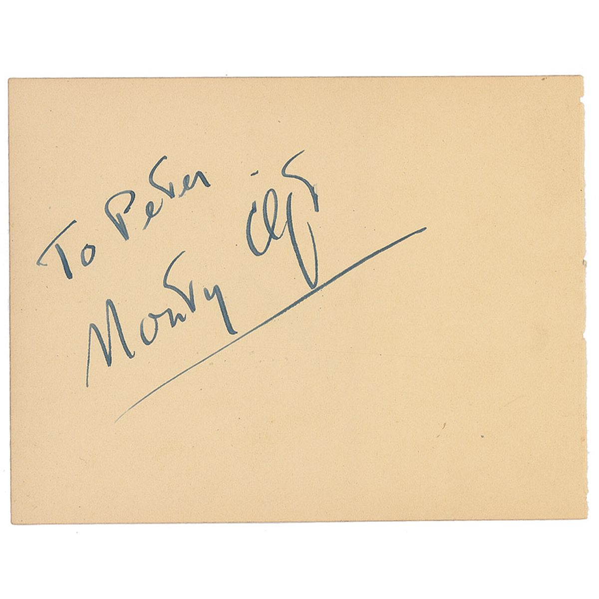 Highly regarded American actor (1920–1966) best known for his Oscar-nominated turns in such classics as Judgment at Nuremberg, From Here to Eternity, and A Place in the Sun. A 1956 car accident which left him disfigured set him on a downward spiral of substance abuse that earned him a reputation for unreliability and led to his death at the age of 45. Vintage fountain pen signature and inscription, “To Peter, Monty Clift,” on a light yellow 5.5 x 4.25 album page. In fine condition.