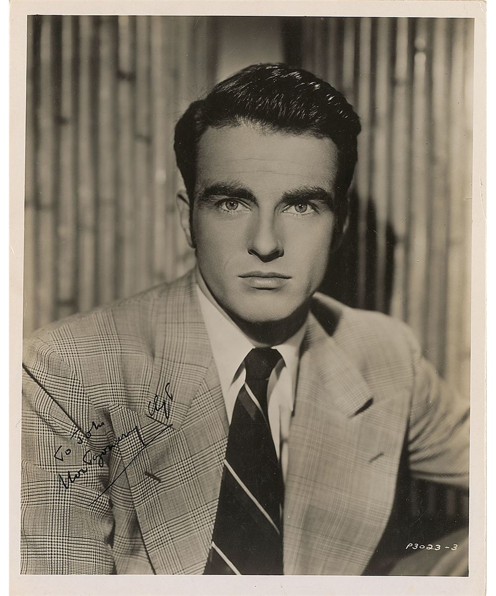 Highly regarded American actor (1920–1966) best known for his Oscar-nominated turns in such classics as Judgment at Nuremberg, From Here to Eternity, and A Place in the Sun. A 1956 car accident which left him disfigured set him on a downward spiral of substance abuse that earned him a reputation for unreliability and led to his death at the age of 45. Vintage glossy 8 x 10 Paramount Films publicity photo, signed and inscribed in fountain pen “To John, Montgomery Clift.” In fine condition.