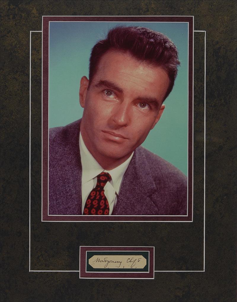 Vintage fountain pen signature, “Montgomery Clift,” on an off-white 2.75 x .75 slip, clipped from a larger sheet. Double matted with a color glossy 8 x 10 photo, to an overall size of 11 x 14. In fine condition, with a few stray ink marks below from a partial signature. Pre-certified PSA/DNA and RRAuction COA.