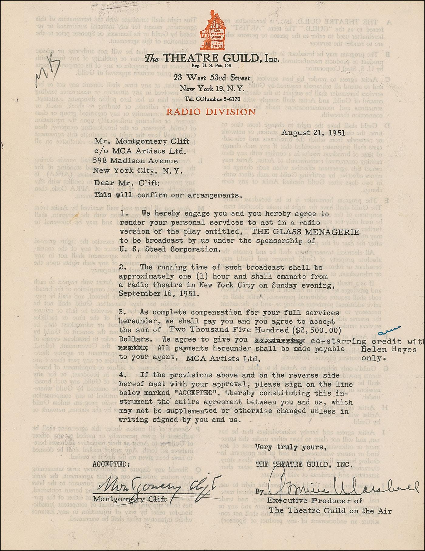 Highly regarded American actor (1920–1966) best known for his Oscar-nominated turns in such classics as Judgment at Nuremberg, From Here to Eternity, and A Place in the Sun. A 1956 car accident which left him disfigured sent him on a downward spiral of substance abuse that earned him a reputation for unreliability and led to his death at the age of 45. DS, one page both sides, 8.5 x 11, August 21, 1951. Agreement between Clift and The Theatre Guild Inc., for Clift to appear in the radio presentation of The Glass Menagerie in September of 1951, for the salary of $2500.00. Signed at the conclusion in black ink by Clift as well as the Theatre Guild’s executive producer. In fine condition, with some scattered light toning and soiling, and a couple small notations.