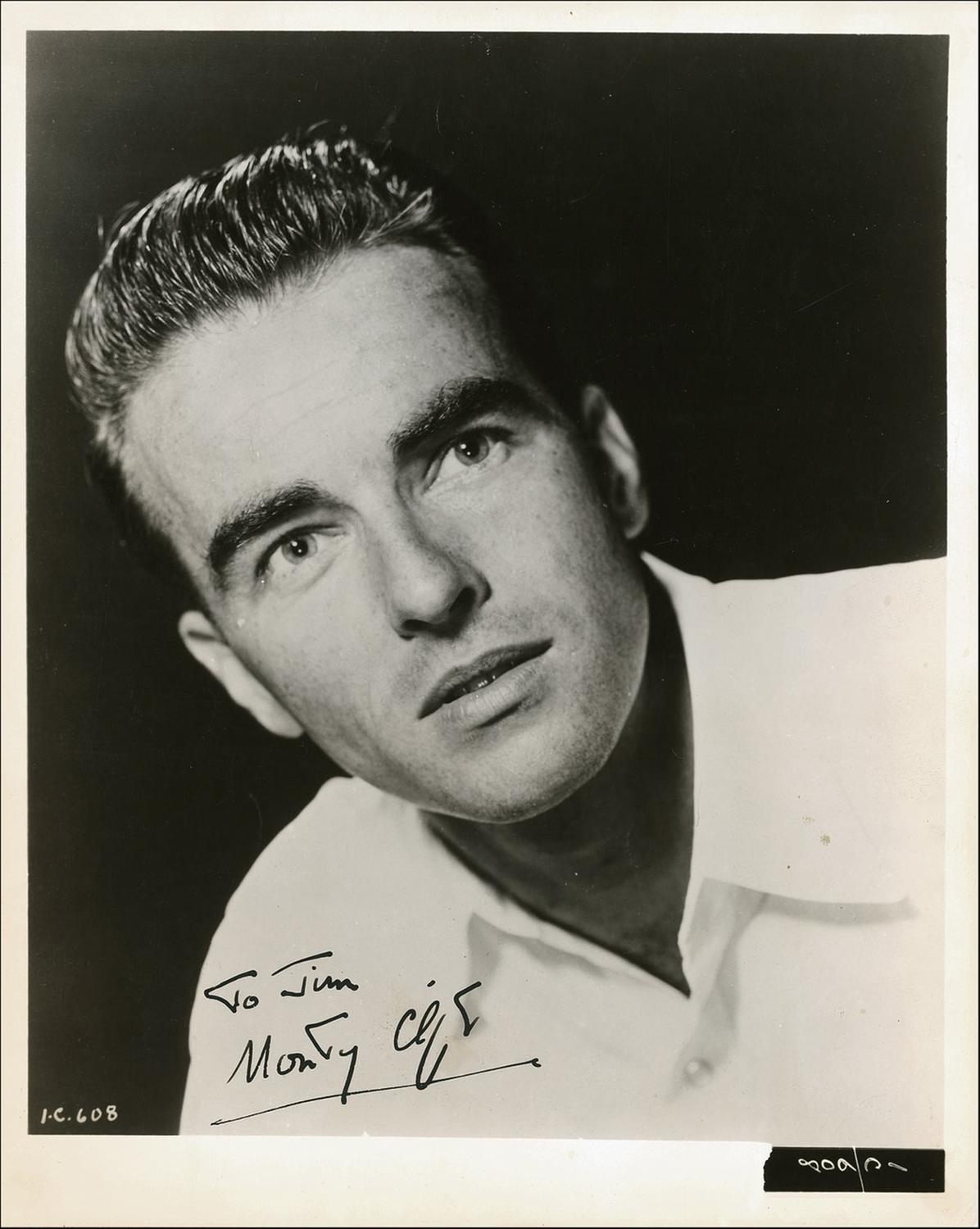 Highly regarded American actor (1920–1966) best known for his Oscar-nominated turns in such classics as Judgment at Nuremberg, From Here to Eternity, and A Place in the Sun. A 1956 car accident which left him disfigured sent him on a downward spiral of substance abuse that earned him a reputation for unreliability and led to his death at the age of 45. Scarce vintage glossy 8 x 10 head-and-shoulders photo, signed and inscribed in fountain pen “To Jim, Monty Clift.” In very good condition, with central horizontal bend through facial area and single letter of signature, scattered surface impressions and dings, and a few creases. Clift signed photos of this size are quite uncommon.