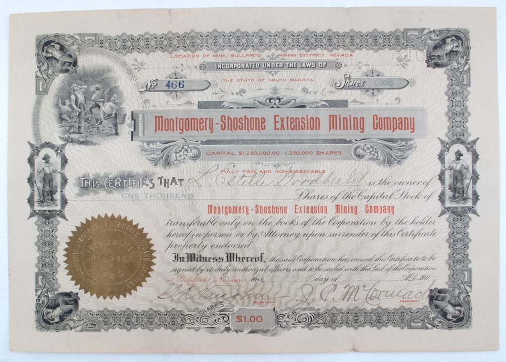 Incorporated in South Dakota. Issued in 1906 at Goldfield, Nevada for 1,000 shares at $1 each to L. Estelle Goodberlet. Uncancelled. Issue date is faded. Signed by J.C. McCormack as president. Seven mining vignettes. Location of Mine: Bullfrog Mining District, Nevada printed on the top. This company likely operated adjacent or close to the most famous and prolific mine of the Bullfrog district, the legendary Montgomery Shoshone. Fold splits at top and bottom right.City: BullfrogCounty: NyeState: NV