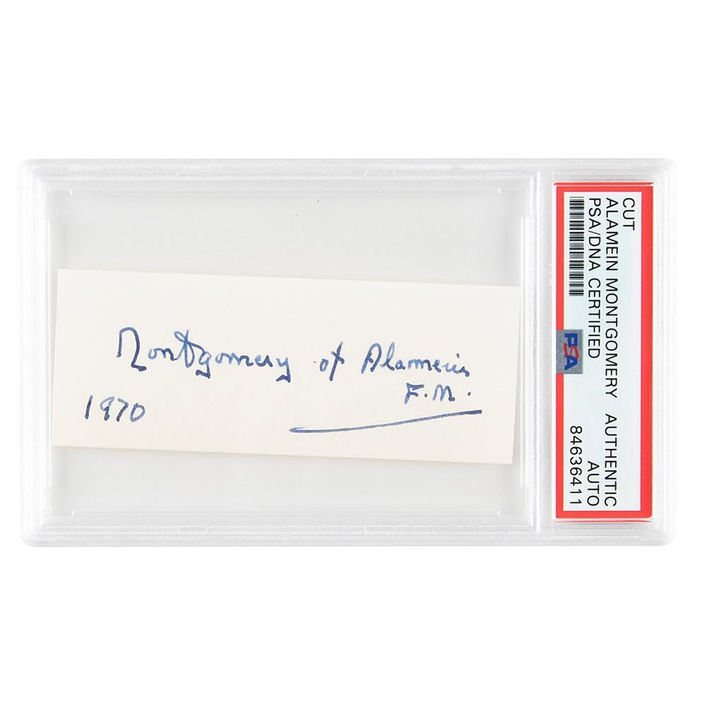 Fountain pen signature, "Montgomery of Alamein, F.M., 1970,†on an off-white 3.75 x 1.5 slip. In very fine condition. Encapsulated in a PSA/DNA authentication holder.