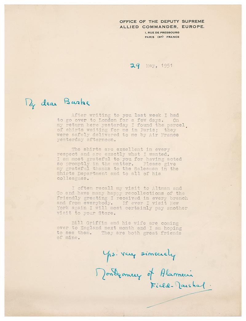 TLS signed “Montgomery of Alamein, Field-Marshal,” one page, 8 x 10.5, Office of the Deputy Supreme Allied Commander, Europe letterhead, May 29, 1951. The field marshal writes “My dear Burke” concerning a clothing purchase. in part: “On my return here yesterday I found the parcel of shirts waiting for me in Paris; they were safely delivered to me by Air France yesterday afternoon. The shirts are excellent in every respect and are exactly what I wanted. I am most grateful to you for having acted so promptly in the matter. Please give my grateful thanks to the salesman in the Shirts Department and to all of his colleagues. I often recall my visit to Altman and Co and have many happy recollections of the friendly greeting I received in every branch and from everyone.” He wrote the recipient’s name at the letter’s start and a closing sentiment prior to his signature. In very good condition, with central horizontal and vertical folds with a vertical fold passing through the middle of his first name, horizontal crease along the bottom border, wrinkling, and edge toning.