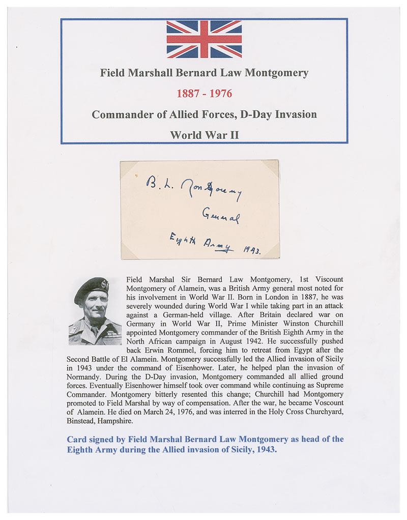 Vintage war-dated fountain pen signature, “B. L. Montgomery, General, Eighth Army 1943,” on an off-white 3.5 x 2 card. Removably presented on a color 8.5 x 11 informational sheet. In fine condition, with a trivial spot next to beginning of signature.