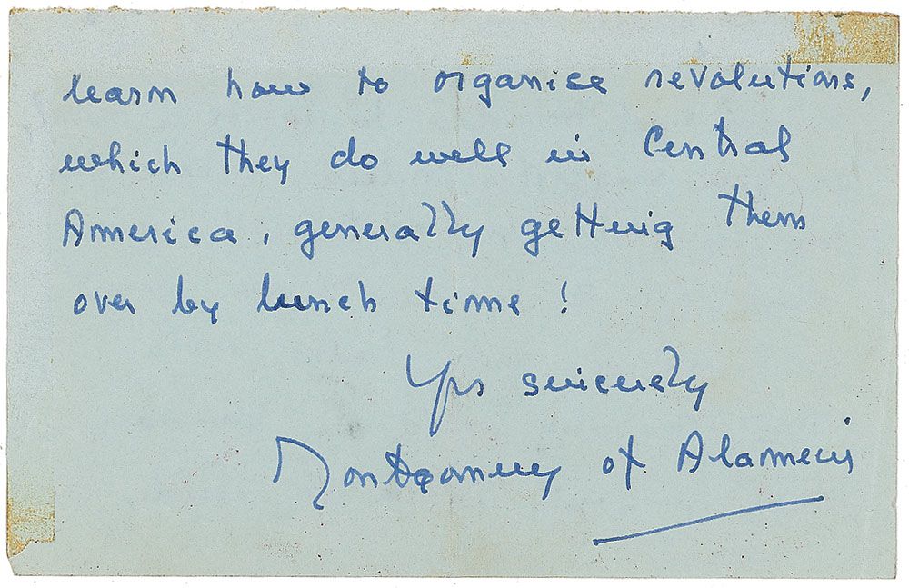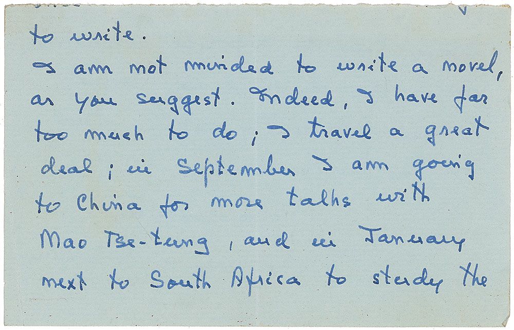 Partial ALS, one page both sides, 5.5 x 3.5, no date. Partial letter, in part: “I travel a great deal; in September I am going to China for more talks with Mao Tse-tung, and in January next to South Africa…learn how to organize revolutions, which they do well in Central America, generally getting them over by lunch time!” A central vertical fold passing through a single letter of the signature, tape remnants to borders, and slight surface loss to reverse upper border, otherwise fine condition.