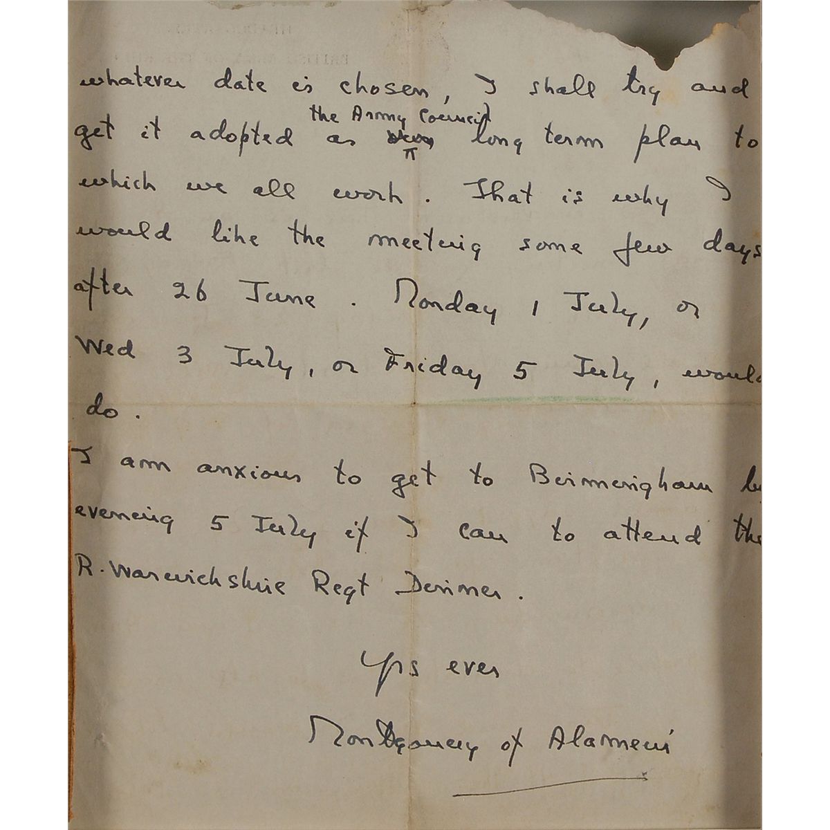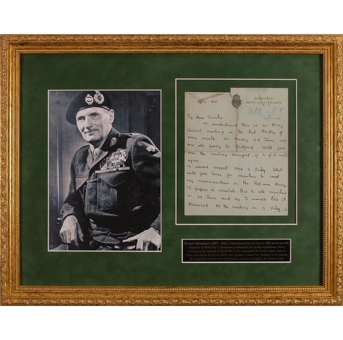 ALS, one page both sides, 6.5 x 8, Headquarters British Army of the Rhine letterhead, September 5, 1946. Letter to “My dear Simbo,” attempting to reschedule a meeting. In part: “I understand there is an Army Council meeting…Will you have the meeting changed, if S of S will agree?…That will give time for members to read my memorandum on the Post-war Army. I propose to circulate this to all members…and say I would like it discussed…I shall try and get it adopted as the Army Council’s long term plan to which we all work.” Double-suede-matted and framed, so both sides may be read, with a portrait of Montgomery and a biographical plaque to an overall size of 21.5 x 17. In very good condition, with central horizontal and vertical folds, one through a single letter of signature, paper loss to top edge, pencil notation to top, and some scattered light toning and soiling.