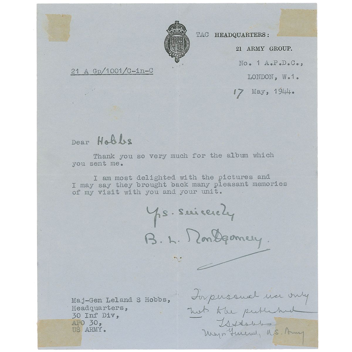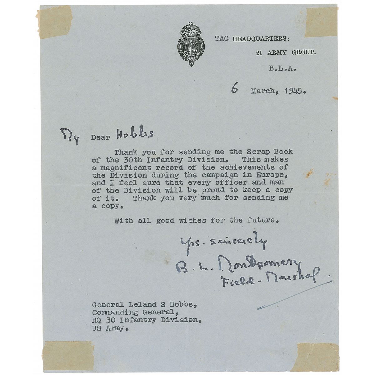Two war-dated TLSs, each signed, “B. L. Montgomery,” adding “Field-Marshall,” under one signature, one-page each, 6.25 x 8, TAC Headquarters stationery, dated 1944 and 1945. Both letters are to General Leland Hobbs. One letter reads, in part: “Thank you for sending me the Scrap Book of the 30th Infantry Division. This makes a magnificent record of the achievements of the Division during the campaign in Europe, and I feel sure that every officer and man of the Division will be proud to keep a copy of it.” In very good condition, with central horizontal and vertical folds, old tape toning to corners, and a pencil notation to bottom of one letter.