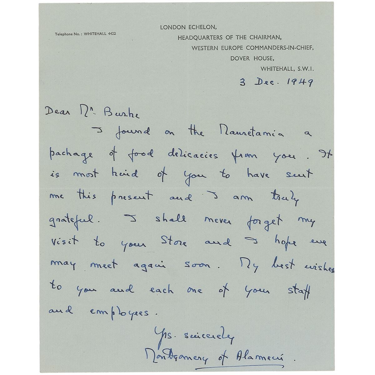 ALS, one page, 7 x 8.75, Dover House letterhead, December 3, 1944. Letter to a shopkeeper. In part: “I found on the Mauretania a package of food delicacies from you. It is most kind of you to have sent me this present and I am truly grateful.” In fine condition, with central vertical and horizontal folds (one vertical fold passing through a single letter of the signature).