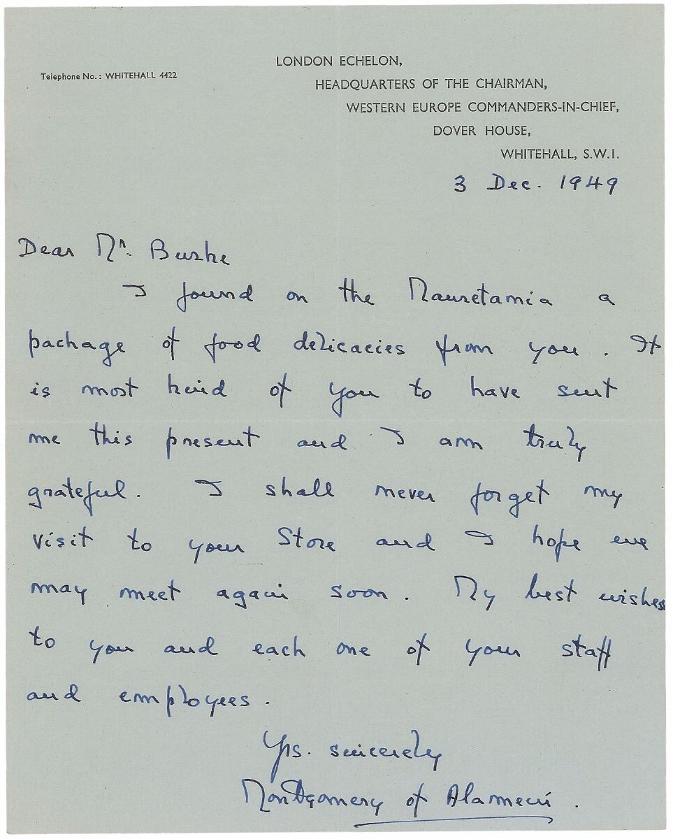 ALS, one page, 7 x 8.75, Dover House letterhead, December 3, 1944. Letter to a shopkeeper. In part: “I found on the Mauretania a package of food delicacies from you. It is most kind of you to have sent me this present and I am truly grateful.” In fine condition, with central vertical and horizontal folds (one vertical fold passing through a single letter of the signature).
