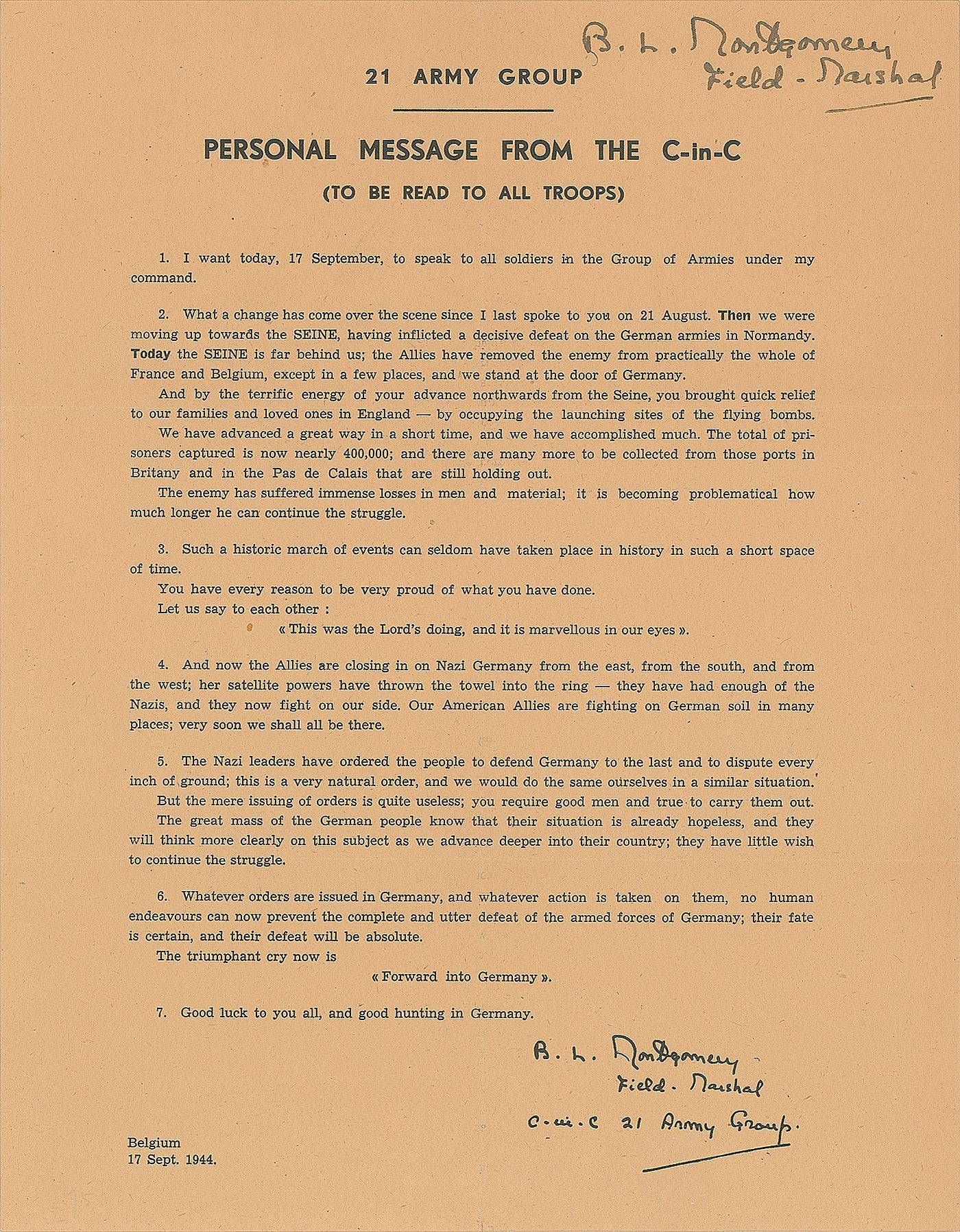 Printed broadside circular document, signed at the top, "B. L. Montgomery, Field-Marshal,” one page, 8.5 x 11, September 17, 1944. Circular headed "21 Army Group, Personal Message from the C-in-C, (To be read to all troops)," in part: "What a change has come over the scene since I last spoke to you on 21 August. Then we were moving up towards the Seine, having inflicted a decisive defeat on the Germany armies in Normandy, France and Belgium, except in a few places, and we stand at the door of Germany…Such a historic march of events can seldom have taken place in history in such a short space of time…Our American Allies are fighting on German soil in many places; very soon we shall be there…Whatever orders are issued in Germany, and whatever action is taken on them, no human endeavours can now prevent the complete and utter defeat of the armed forces of Germany; their fate is certain, and their defeat will be absolute. The triumphant cry now is 'Forward into Germany'…Good luck to you all, and good hunting in Germany." Also bears a pre-printed facsimile signature at the conclusion. In very good condition, with intersecting folds.