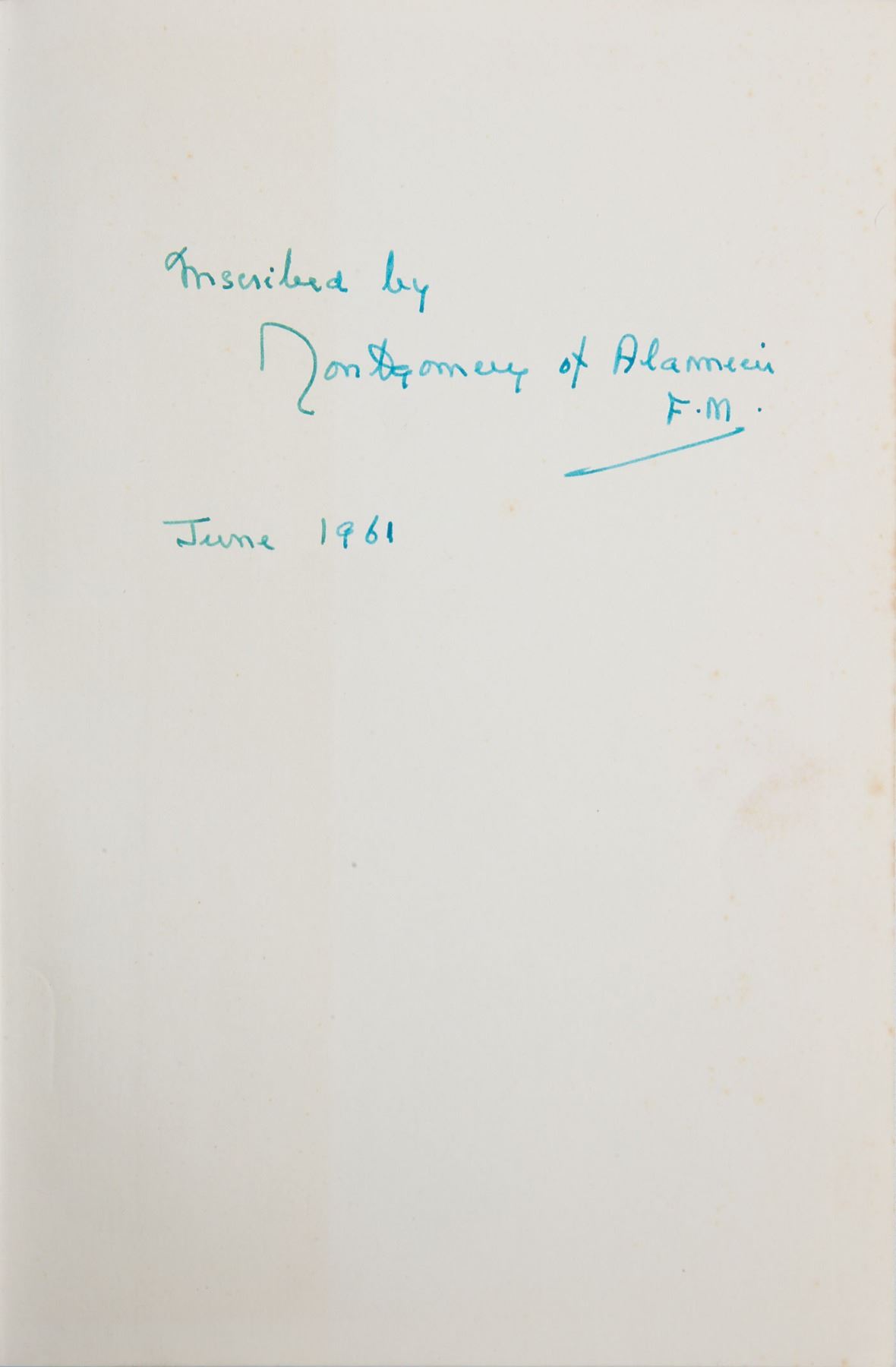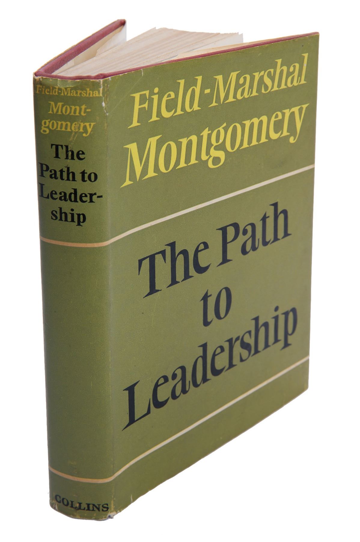 Signed book: The Path to Leadership. First edition. London: Collins, 1961. Hardcover with dust jacket, 5.75 x 8.5, 256 pages. Signed on the first free end page in fountain pen, "Inscribed by Montgomery of Alamein, F.M., June 1961." In fine condition, with a light block of toning to signed page.