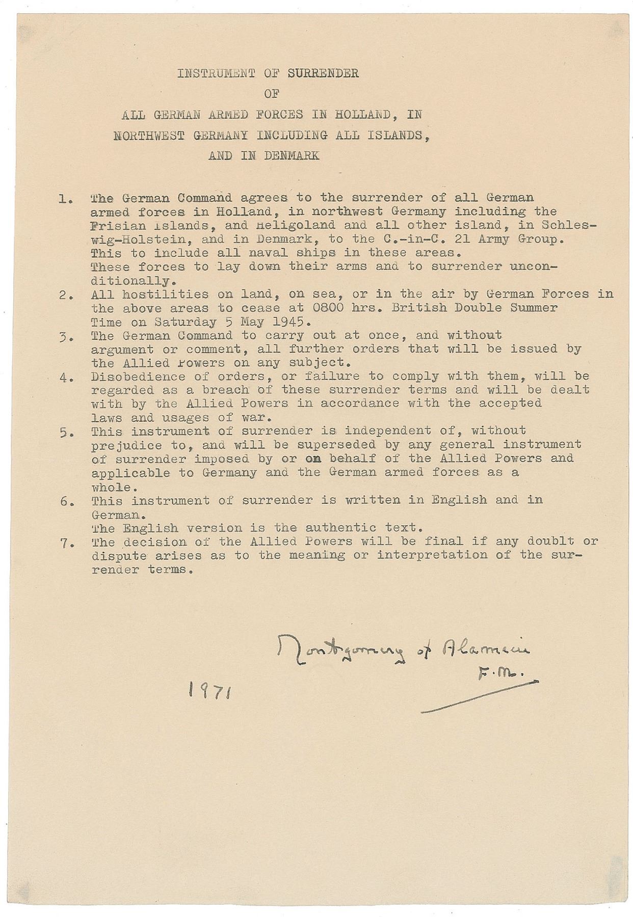 Souvenir typescript, one page, 8 x 11.5, signed at the conclusion in fountain pen, "Montgomery of Alamein, F.M., 1971." The "Instrument of Surrender of All German Armed Forces in Holland, in Northwest Germany Including All Islands, and in Denmark," containing seven provisions of the surrender. In fine condition, with scattered light creasing and a central horizontal fold.