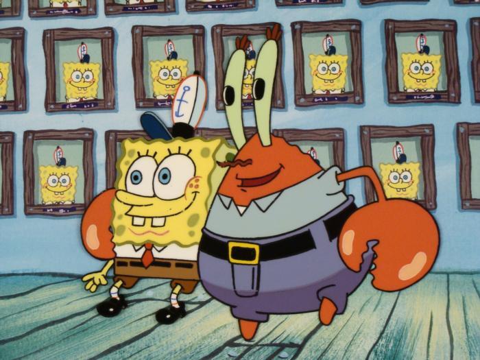 This animation cel and reproduction background are from the Nickelodeon TV show SpongeBob Squarepants. The story takes place under the deep blue sea in Bikini Bottom, where SpongeBob resides. SpongeBob, who is a yellow, porous sponge, is your typical happy-go-lucky character, as he is always cheerful and enjoys making people laugh. Patrick Star, SpongeBob's neighbor who is a starfish, is your average children's show idiot, as he boasts knowing nothing and is often getting himself into ridiculous situations. Between the homes of these two lies the home of the miserable Squidward, a squid, who is known for being grouchy and playing tricks on SpongeBob and Patrick. Both SpongeBob and Squidward work at the Krusty Krab, a fast food business run by the greedy money-loving Mr. Krabs, a crab, the arch rival of the evil, possibly misunderstood, Plankton. Another neighbor, Sandy Cheeks, an athletic squirrel who normally wears an astronaut's space suit, was introduced in "Tea at the Treedome." She spends most of her time inventing and experimenting. SpongeBob has been employee of the month for many months.Original Printed Background and Animated Cel Overall Size of Background: 10 1/2" x 17" Overall Size of the Cel: 10 1/2" x 12 1/2" Very good condition This is an original hand-painted cel set-up used in the production of an episode of "SpongeBob SquarePants." Each one-of-a-kind set-up represents a slight change in position of the characters. When individually photographed and projected in rapid succession, the images appear to move.
