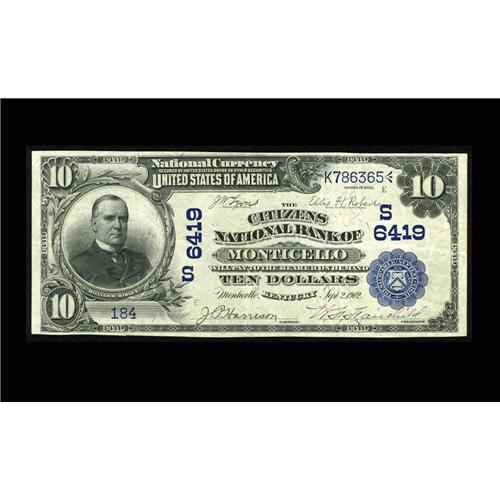 <B>Monticello, KY</B></I> - $10 1902 Date Back Fr. 616 <B>The Citizens NB</B></I> Ch. # (S)6419<BR>This is the only collectible bank in town (the other institution chartered here issued First Charters only and is unreported), and notes from here, while not exceptionally rare, are usually found in quite mediocre condition. This Date Back is a happy exception, and continues the Gale collection tradition of offering the finest known large example from each bank whenever possible. Bright <B>Very Fine+++,</B></I> with great pen signatures.